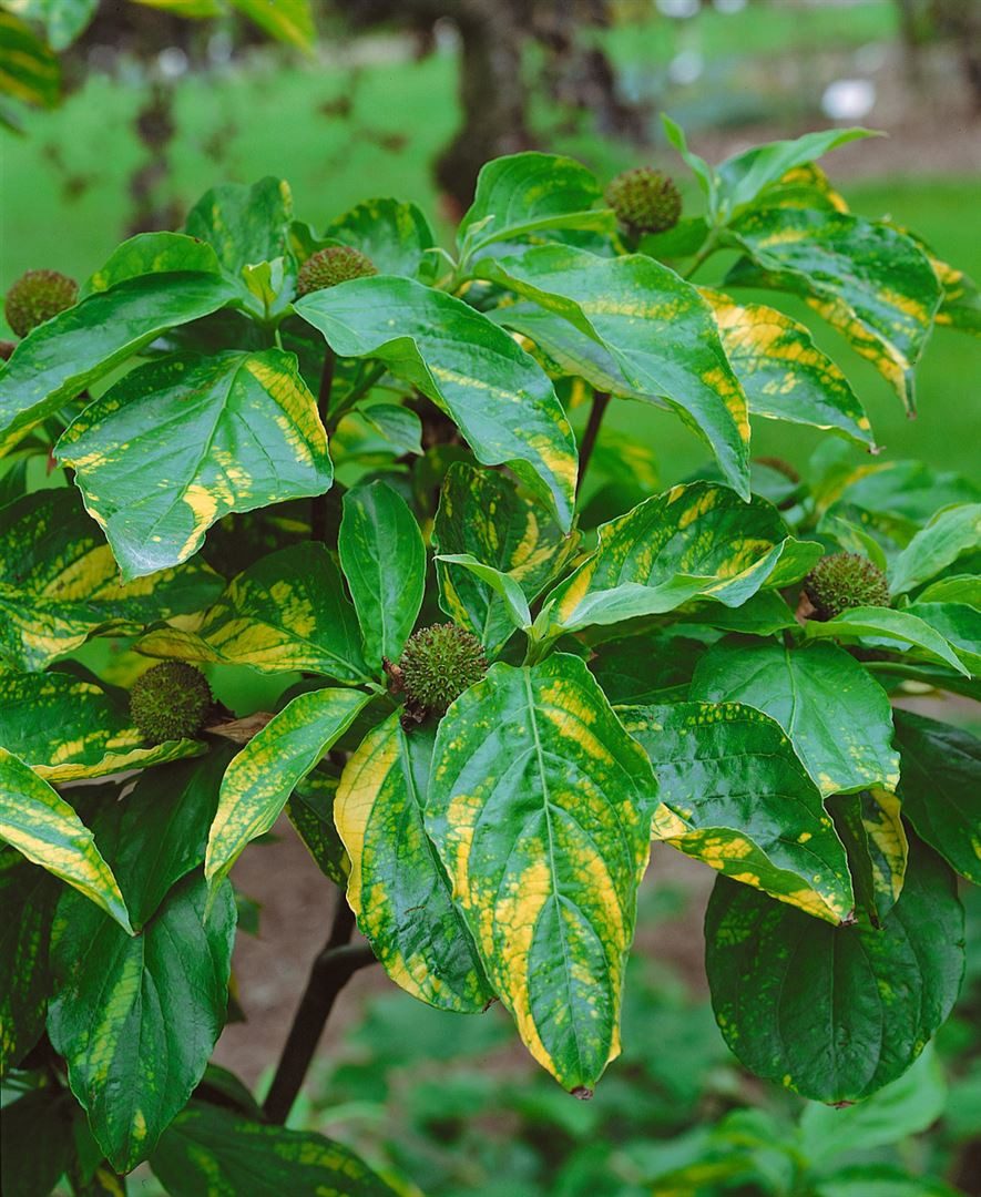 Weissbluehender Bluetenhartriegel Cornus nuttallii Ascona mit grossen Hochblaettern im Mai Juni oft dekorative rote Fruchtstaende danach