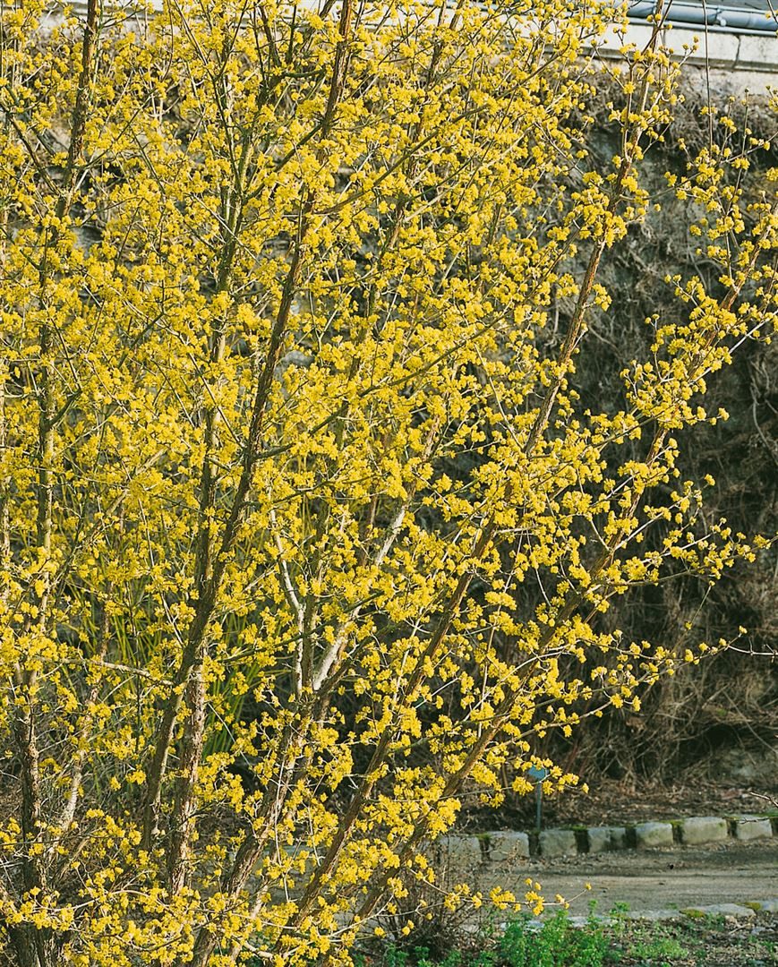 Fruehbluehend Cornus officinalis mit leuchtend gelben Dolden ab Februar und Maerz vor dem Laubaustrieb frueher Farbakzent im Garten