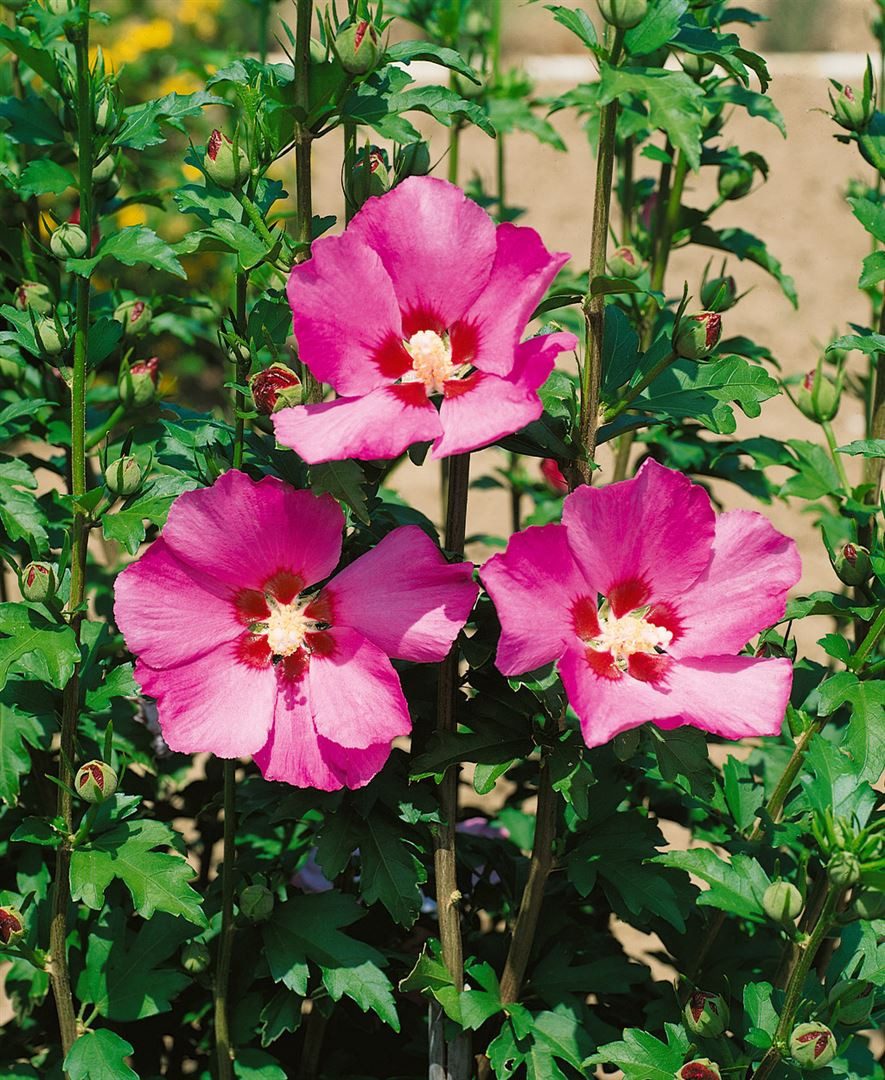 Aufrechter dichtbuschiger Hibiscus syriacus Sorte Maike mit Endhoehe 150 bis 250 cm Breite 100 bis 150 cm und langsamem Wuchs