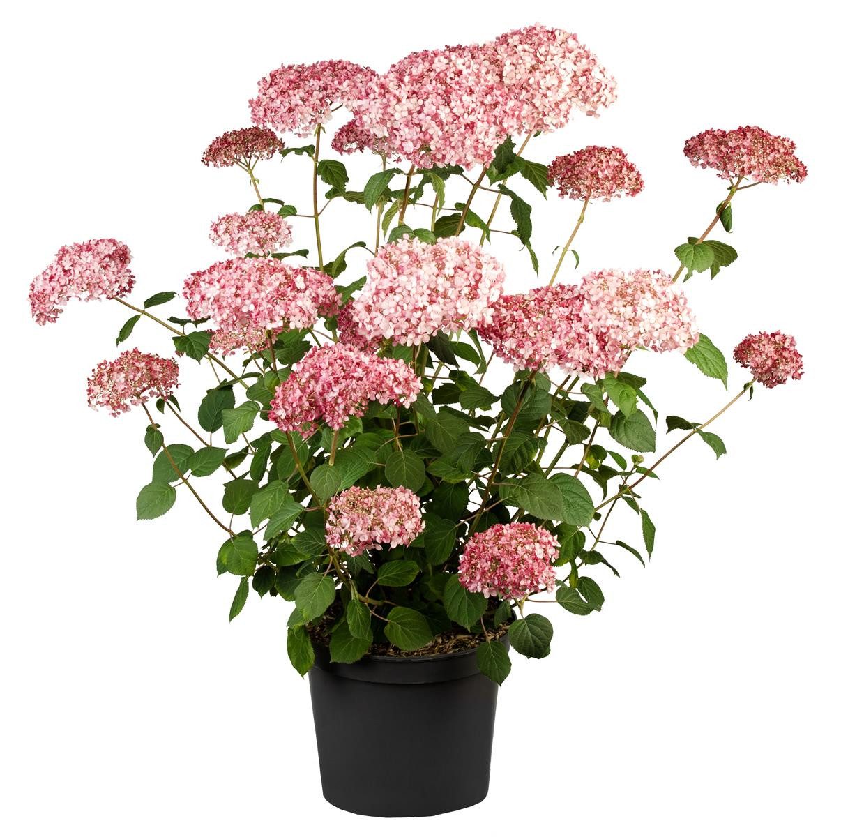 Hydrangea arborescens ‘Pink Annabelle’ –R–, auf Deutsch als Wald-Hortensie oder Schneeball-Hortensie bekannt, begeistert als eleganter Blütenstrauch mit üppigen, kugeligen Blütenständen in sattem Rosaton. Von Juni bis in den September öffnen sich die großen Blütenbälle auf stabilen, standfesten Trieben, die auch bei Sommerregen ihre Form behalten. Das frischgrüne, breit-eiförmige Laub bildet einen attraktiven Kontrast und unterstreicht die harmonische, rundbuschige Wuchsform. Als vielseitiger Zierstrauch eignet sich diese Hortensie hervorragend für das Staudenbeet, den Vorgarten und klassische Rabatten, wirkt als Solitär im Rasen ebenso eindrucksvoll wie in Gruppenpflanzungen entlang von Wegen und als niedrige Heckenpflanze, und lässt sich dank ihres kompakten Wuchses zudem gut als Kübelpflanze auf Terrasse oder Balkon kultivieren. Der ideale Standort ist halbschattig bis sonnig mit gleichmäßig frischer, humoser und gut durchlässiger Erde, leicht sauer bis neutral; regelmäßige Bewässerung in Trockenphasen fördert anhaltende Blütenfülle. Eine Mulchschicht hält die Bodenfeuchte, und eine maßvolle Nährstoffgabe im Frühjahr unterstützt vitalen Austrieb. Da ‘Pink Annabelle’ am diesjährigen Holz blüht, empfiehlt sich ein kräftiger Rückschnitt im späten Winter, um dichte, blühfreudige Triebe anzuregen. Die winterharte Gartenhortensie erreicht je nach Standort etwa 1 bis 1,5 Meter Höhe und Breite und lässt sich ideal mit Gräsern, Funkien, Farnen oder Rosen kombinieren, wodurch im Gartenbeet stimmige, lange wirkende Kompositionen entstehen.