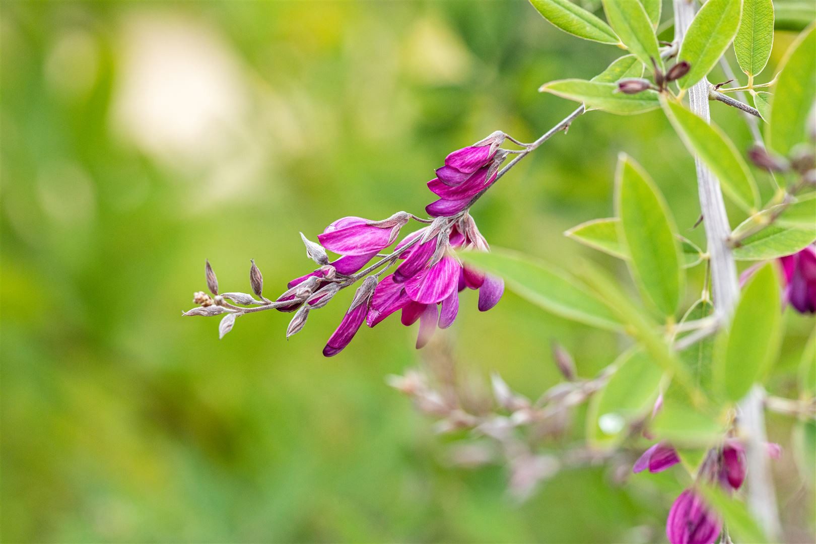 Lespedeza thunbergii, der Thunberg-Buschklee, ist ein eleganter Blütenstrauch mit anmutig überhängenden Trieben, der als Zierstrauch oder Gartenstrauch in sonnigen Beeten und warmen Vorgärten besondere Akzente setzt. Von Spätsommer bis in den Herbst entfaltet er unzählige schmetterlingsförmige, rosig bis purpurfarben leuchtende Blüten in lockeren Trauben, die wie ein blühender Wasserfall über dem feinen, dreiteiligen Laub liegen. Die sommergrünen, hell- bis mittelgrünen Blätter und die bogig wachsende, locker-fountainartige Wuchsform verleihen dem Buschklee eine außergewöhnliche Leichtigkeit, die besonders als Solitär zur Geltung kommt, ebenso aber in einer harmonischen Gruppenpflanzung mit Ziergräsern und spätsommerlichen Stauden. Als Kübelpflanze auf sonnigen Terrassen oder an geschützten Hauswänden überzeugt er mit mediterranem Flair und zuverlässiger Spätblüte, während er im Beet durch seine breite Silhouette Struktur und Tiefe schafft. Ein vollsonniger, warmer Standort und ein durchlässiger, eher magerer bis sandig-lehmiger Boden fördern reiche Blütenbildung; Staunässe sollte vermieden werden, da die Pflanze winterliche Nässe schlecht verträgt. Nach dem Winter wird Lespedeza thunbergii idealerweise kräftig zurückgeschnitten, da er am jungen Holz blüht und so dicht und vital austreibt. In klimatisch raueren Lagen empfiehlt sich ein windgeschützter Platz mit leichtem Winterschutz im Wurzelbereich. Mäßige Wassergaben und eine zurückhaltende Düngung genügen, sodass der pflegeleichte Buschklee als Blütenstrauch im Beet, im Vorgarten oder im großen Kübel lange Freude bereitet.