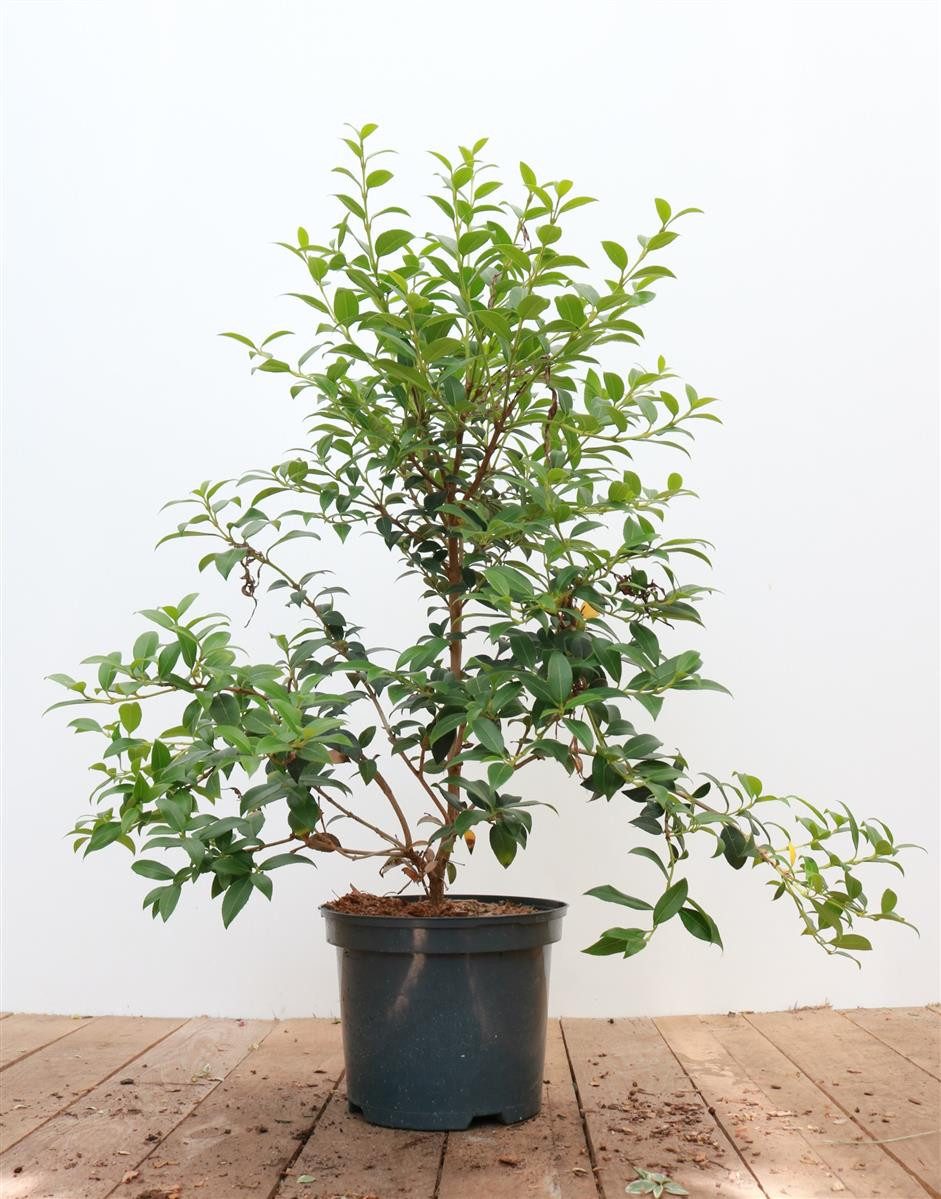 Osmanthus × burkwoodii, die Burkwood-Duftblüte, ist ein elegant-immergrüner Blütenstrauch, der mit seinem dichten, fein verzweigten Aufbau und einem betörenden Blütenduft begeistert. Der kompakte Gartenstrauch trägt glänzend dunkelgrüne, ledrige Blätter und zeigt im Frühjahr, meist von April bis Mai, zahlreiche cremeweiße bis reinweiße, sternförmige Blüten, die den Zierstrauch zu einem Höhepunkt im Vorgarten oder Staudenbeet machen. Dank seines gleichmäßigen, rundlich-buschigen Wuchses eignet sich dieses Solitärgehölz ebenso für kleine Gärten wie für strukturierte Pflanzungen, formale Beete und immergrüne Hecken. Als Heckenpflanze sorgt Osmanthus × burkwoodii für einen gepflegten, dichten Sichtschutz, lässt sich gut in Form schneiden und bleibt dabei über Jahre vital und standfest. Auch im Kübel auf Terrasse oder Balkon überzeugt die Duftblüte als attraktive Kübelpflanze mit edler Ausstrahlung und ganzjährigem Blattkleid. Am liebsten wächst sie an einem sonnigen bis halbschattigen, warmen und windgeschützten Standort in durchlässigem, humosem Gartenboden; leichte kalkhaltige Substrate werden gut toleriert, Staunässe sollte vermieden werden. Eine gleichmäßige, eher maßvolle Wasserversorgung, gelegentliche organische Nährstoffgaben und ein behutsamer Rückschnitt nach der Blüte fördern die Blühfreude und halten den Blütenstrauch kompakt. In Gruppenpflanzungen, als Hintergrund im Beet, im Eingangsbereich oder als edler Solitär setzt Osmanthus × burkwoodii das ganze Jahr über strukturstarke, immergrüne Akzente und verbindet duftende Frühjahrsblüte mit dauerhaftem Blattschmuck.