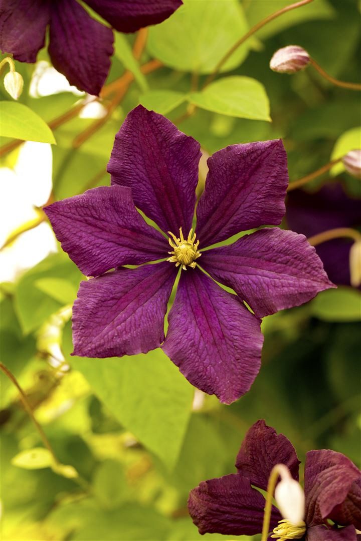 Kletternde Clematis viticella mit einer Wuchshoehe von circa 3 bis 4 m ist ideal fuer Rankgitter Pergolen Zaeune und als Rosenbegleiter