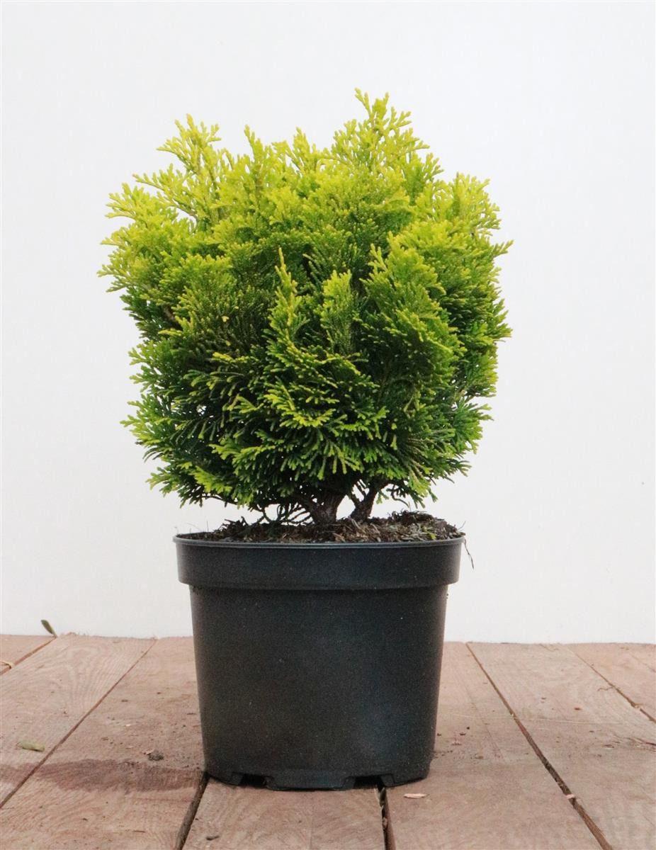 Chamaecyparis obtusa ‘Nana Aurea’, die Zwerg-Hinoki-Scheinzypresse, ist ein apartes, immergrünes Nadelgehölz mit edlem Charakter und leuchtend goldgelbem Austrieb. Ihre fächerartig angeordneten Schuppen bilden dichte, weiche Fächer, die im Frühjahr goldgelb strahlen und im Jahresverlauf zu warmem Gelbgrün übergehen. Der Wuchs ist sehr langsam, kompakt und gleichmäßig, meist kissen- bis kegelförmig, wodurch sich dieses Ziergehölz ideal für strukturgebende Pflanzungen eignet. Als Solitär im Vorgarten, in der Steingarten-Komposition, im Japangarten oder als formschöne Kübelpflanze auf Terrasse und Balkon setzt die Sorte edle Akzente; ebenso lässt sie sich in kleinen Gruppen mit Heide, Gräsern oder niedrigen Stauden kombinieren, wo sie durch ihre ganzjährige Blattwirkung überzeugt. Am besten gedeiht die Hinoki-Scheinzypresse an einem sonnigen bis halbschattigen Standort; je mehr Licht, desto intensiver die Goldfärbung, dabei sind windgeschützte Plätze mit gleichmäßiger Bodenfeuchte günstig. Der Boden sollte humos, gut drainiert und leicht sauer bis neutral sein; Staunässe bitte vermeiden, während leichte Sommerfrische geschätzt wird. Schnitt ist nicht nötig, ein behutsames Ausputzen genügt, und eine dünne Mulchschicht hilft, die Feuchtigkeit zu halten. Im Frühjahr unterstützt ein moderater Koniferendünger den dichten, gesunden Aufbau. Dank ihres gedrungenen Wuchses eignet sich Chamaecyparis obtusa ‘Nana Aurea’ für kleine Beete, Grabanlagen und den Rand von Gehölzrabatten ebenso wie als langlebiges Formgehölz im Kübel. Sie bringt Struktur in jede Jahreszeit und verleiht Beeten und Pflanzgefäßen eine ruhige, elegante Note, die moderne wie klassische Gartengestaltungen bereichert.