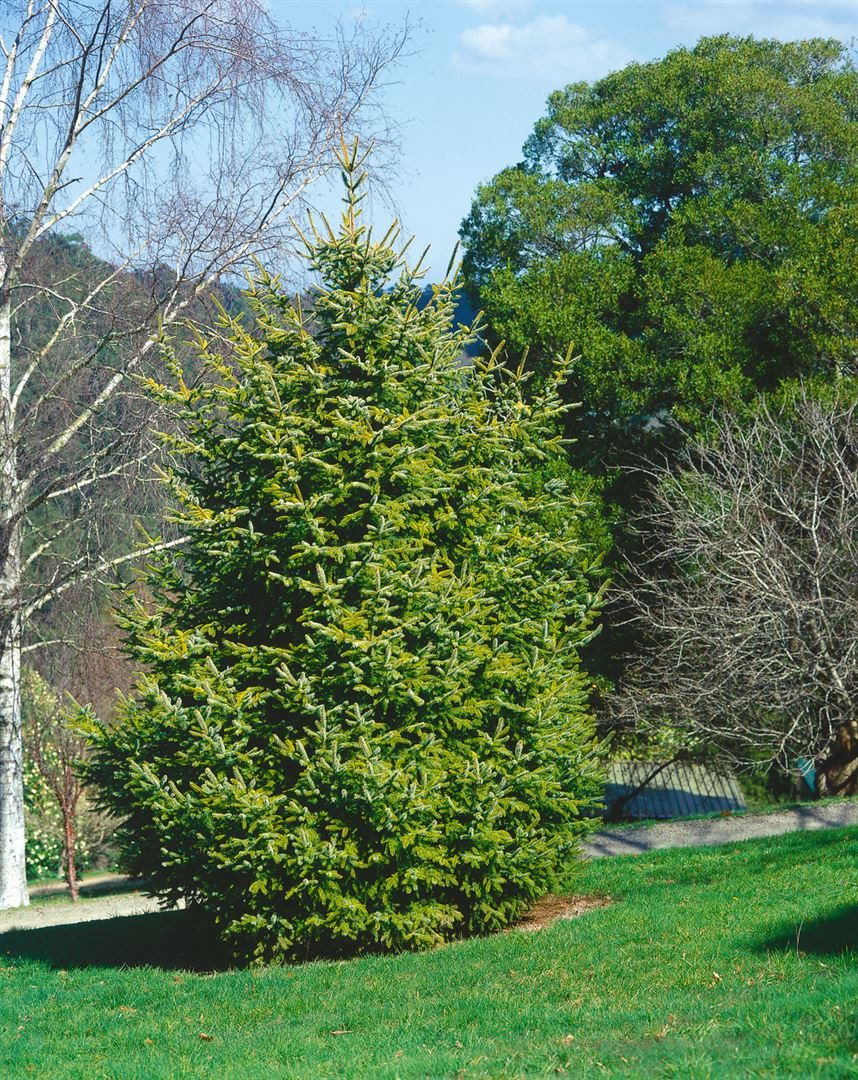 Dichter gleichmäßiger kegelförmiger Wuchs und strukturstarker Blickfang im Garten