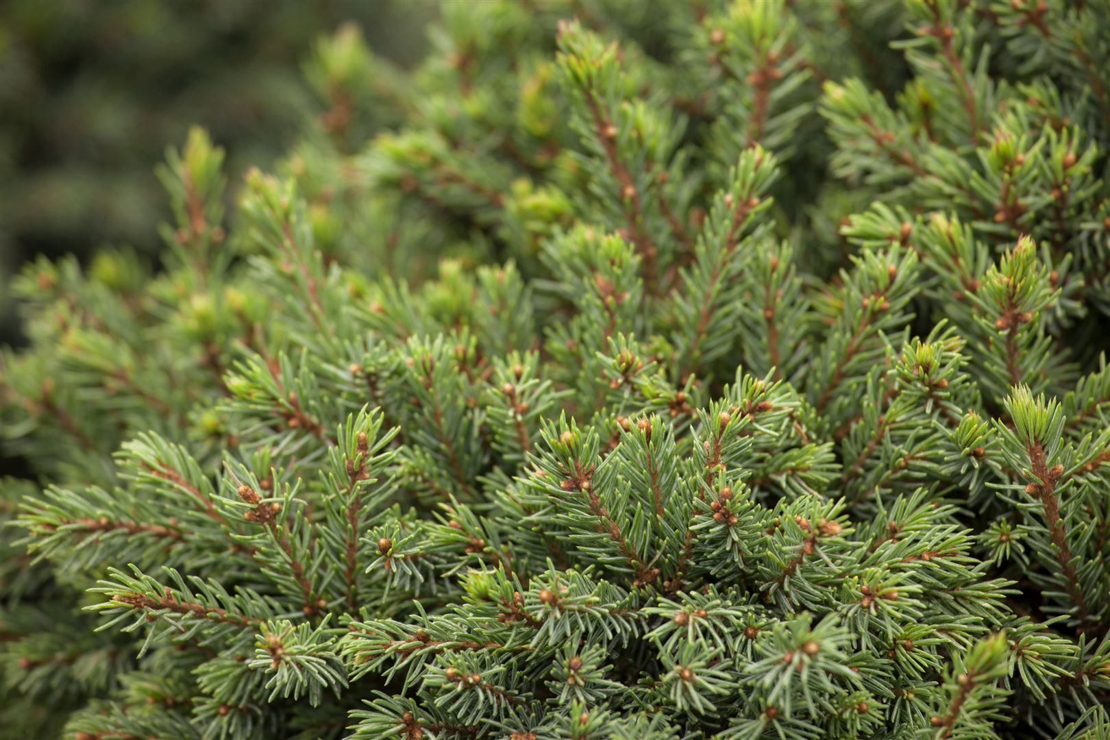 Zwerg Weissfichte Picea glauca Echiniformis mit dichter flach kissenfoermiger Krone und immergruenen blaugruenen Nadeln