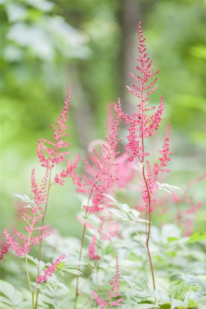 Prachtspiere Astilbe glaberrima Sprite mit zarten rosa Rispen von Juli bis August mit glaenzend gefiedertem Laub und kompaktem niedrigem Wuchs von etwa 15 bis 25 cm