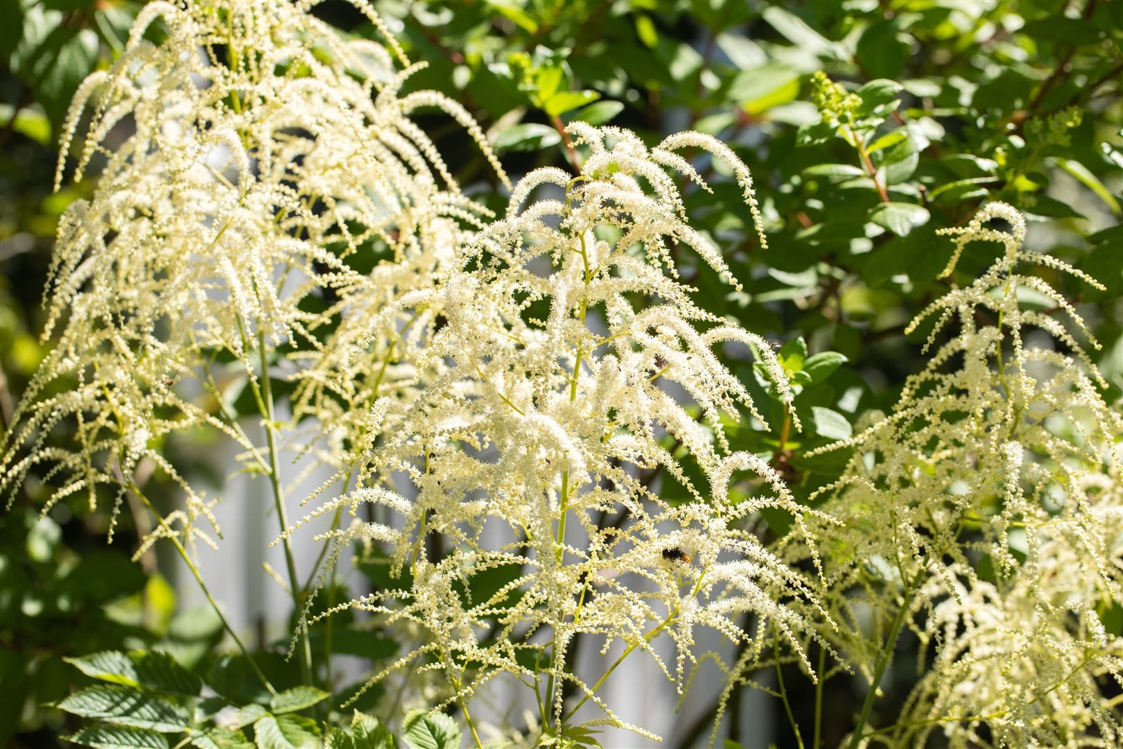 Edle Prachtspiere Astilbe thunbergii Van der Wielen mit cremeweissen elegant ueberhaengenden Bluetenrispen im Spaetsommer