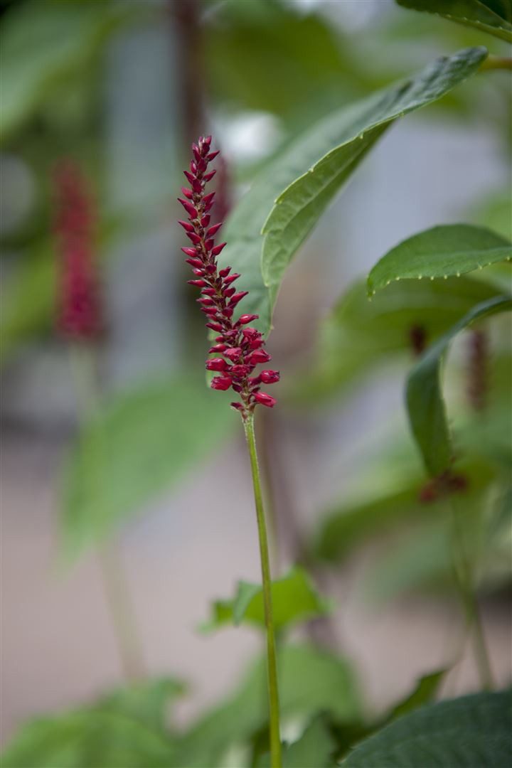 Bistorta amplexicaulis var pendula mit haengenden Bluetenaehren in Rosa bis Karmin von Juli bis Oktober sommergruenes dekoratives Laub