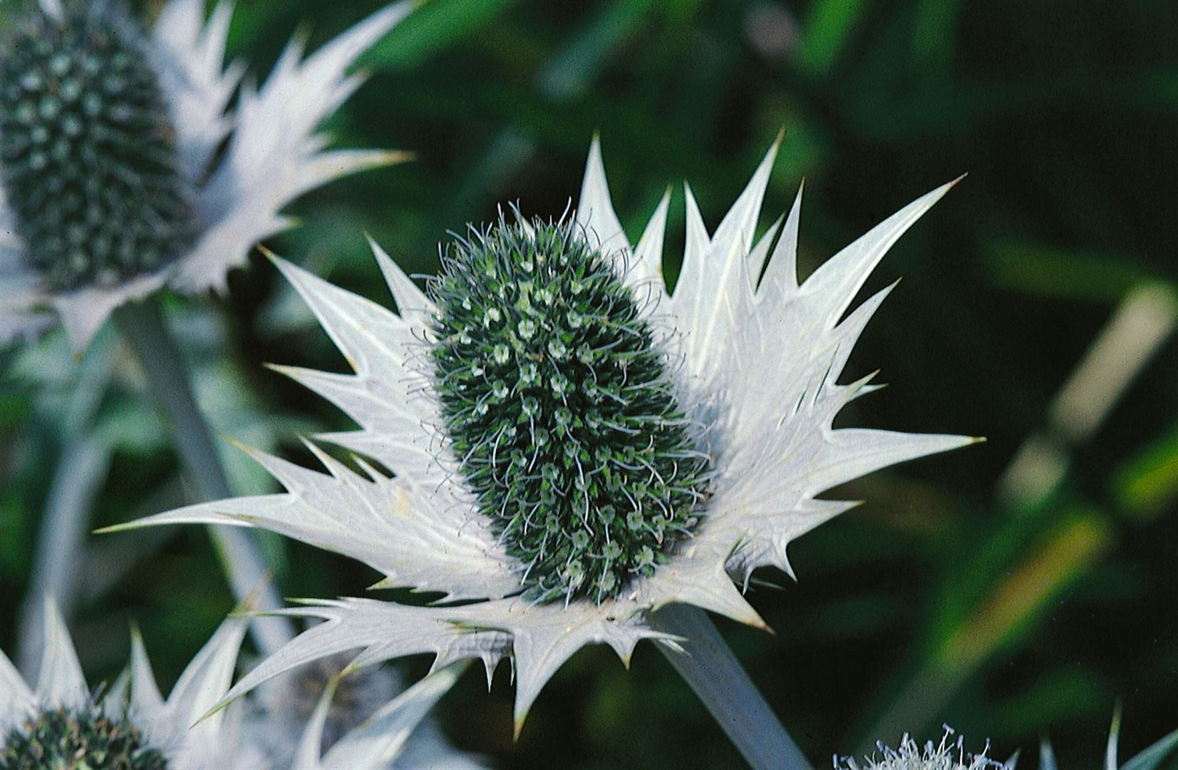 Auffaellige silbrig blaue Disteldolden von Juni bis August Eryngium giganteum setzt architektonische Akzente im Staudenbeet