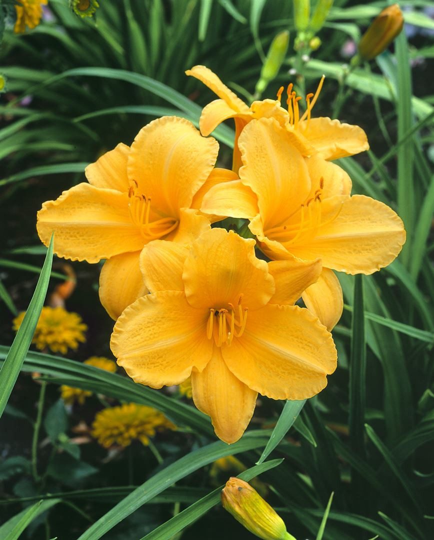 Hemerocallis x cult. ‘Golden Prize’, die Taglilie ‘Golden Prize’, ist eine robuste, reichblühende Gartenstaude, die mit leuchtend goldgelben, großen Trichterblüten den Sommer ins Beet holt. Als klassische Blütenstaude bildet sie dichte, horstige Büsche mit elegant überhängendem, grasartigem Laub, das den Blüten eine attraktive Kulisse bietet. Die Blütezeit erstreckt sich je nach Witterung von Juni bis August, oft mit einer leichten Remontierung, sodass sich über Wochen stets neue Blüten öffnen. Mit einer Wuchshöhe von etwa 60 bis 80 cm wirkt diese Zierpflanze in Rabatten, Staudenbeeten und am Teichrand ebenso überzeugend wie im Vordergrund gemischter Pflanzungen. ‘Golden Prize’ eignet sich als Solitär für den Vorgarten, in harmonischer Gruppenpflanzung oder als unkomplizierte Kübelpflanze auf Terrasse und Balkon. In sonniger bis halbschattiger Lage entwickelt die Taglilie die meisten Knospen; je mehr Licht, desto üppiger die Blütenfülle. Der Boden sollte humos, nährstoffreich und gut durchlässig sein, am liebsten gleichmäßig frisch, wobei die Pflanze nach der Etablierung auch kurze Trockenphasen toleriert. Ein leichter Rückschnitt verwelkter Blütenstiele fördert die Blühfreude, im Spätherbst kann das Laub bodennah entfernt werden. Teilung älterer Horste alle paar Jahre erhält Vitalität und Blühfreude und liefert gleichzeitig neue Pflanzen für Beet und Randbepflanzung. In Kombination mit Ziergräsern, Rosen oder anderen Sommerstauden wie Phlox und Salvia entsteht ein lebendiges, pflegeleichtes Bild, das klassische Beetgestaltung und moderne Gartengestaltung gleichermaßen bereichert. Als vielseitiger Zierstrauch-Ersatz im Staudenbeet überzeugt diese Gartenstaude durch stabile Standfestigkeit und eine klare, strukturierende Wuchsform.
