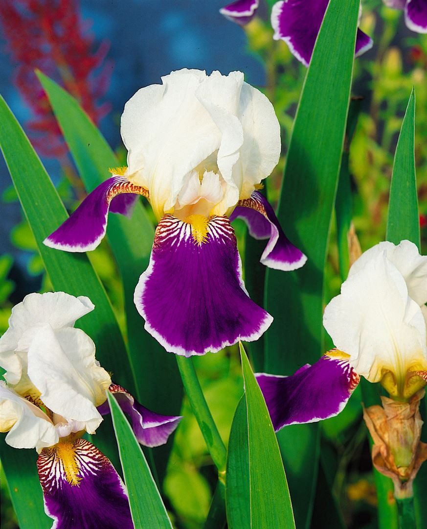 Die Iris x barbata-elatior ‘Wabash’, auf Deutsch Hohe Bart-Iris ‘Wabash’, ist eine klassische Blütenstaude mit eindrucksvoller Zweifarbigkeit. Ihre edlen Blüten erscheinen von Mai bis Juni und zeigen schneeweiße, leicht gewellte Domblätter, die mit samtig violettpurpurnen Hängeblättern kontrastieren; eine goldgelbe bis cremefarbene Bartleiste setzt einen leuchtenden Akzent und ein feiner Duft rundet den Auftritt ab. Der aufrechte, horstbildende Wuchs mit schwertförmigem, graugrünem Laub verleiht dieser Gartenstaude auch außerhalb der Blüte Struktur und Eleganz. Mit einer Höhe von etwa 80 bis 100 cm eignet sich die ‘Wabash’ hervorragend für den vorderen bis mittleren Beetbereich, als markanter Solitär oder in stimmigen Gruppenpflanzungen in Rabatten und Bauerngärten. Ebenso schmückt sie repräsentative Vorgärten und kann in ausreichend großen, gut drainierten Kübeln auf Terrasse und Sitzplatz als Zierpflanze glänzen; als Schnittblume setzt sie edle Akzente in der Vase. Am liebsten wächst diese Bart-Iris an einem vollsonnigen, warmen Standort mit durchlässigem, eher kalkhaltigem und mäßig nährstoffreichem Boden. Staunässe sollte unbedingt vermieden werden, da das flach liegende Rhizom luftige Verhältnisse benötigt. Eine mineralische Abdeckung oder leichte Sandbeimischung fördert die Abtrocknung, und die Rhizome werden flach gepflanzt, sodass sie teilweise sichtbar bleiben. Pflegeleicht und langlebig zeigt sich die Staude dank guter Winterhärte robust; nach der Blüte werden die Stiele zurückgeschnitten, das Laub im Spätsommer eingekürzt und der Horst alle paar Jahre zur Verjüngung geteilt, sodass die ‘Wabash’ zuverlässig mit beeindruckender Blütenpracht überzeugt.