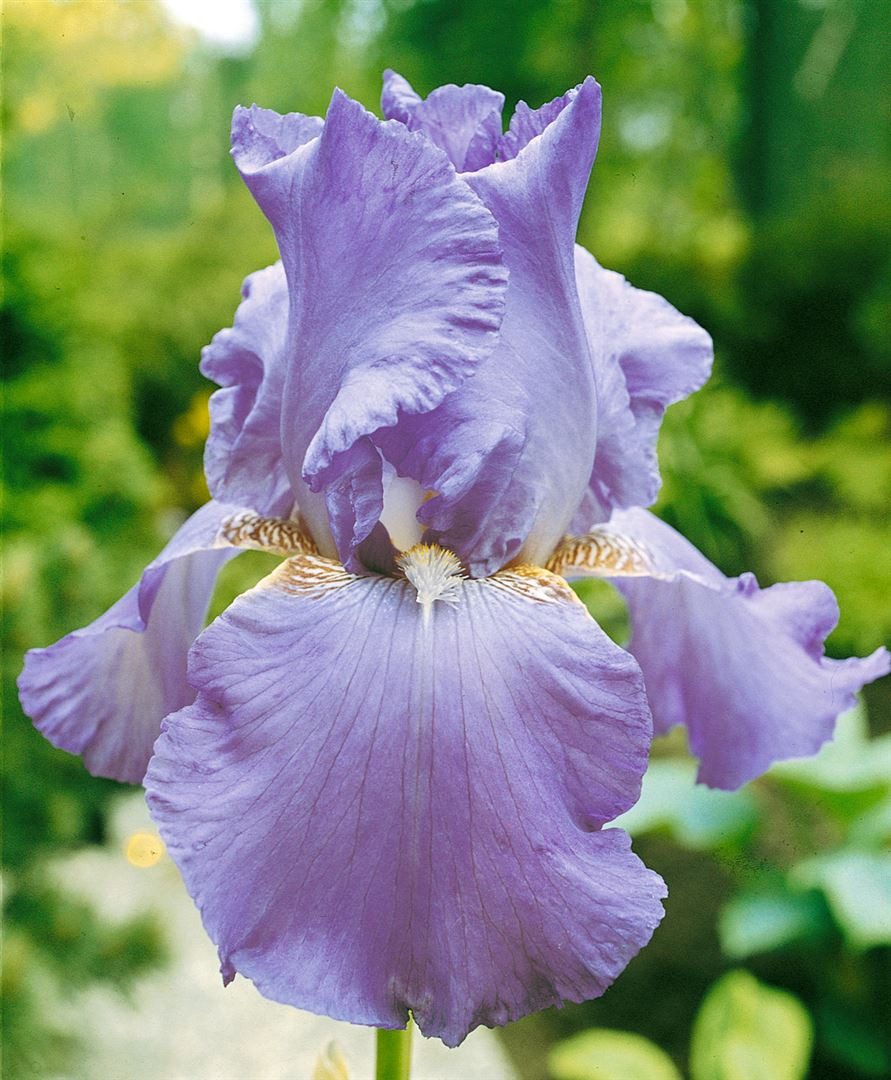 Iris × barbata-elatior ‘Lovely Again’, die Hohe Bart-Iris oder Schwertlilie, verbindet elegante Blüten mit robuster Gartenpraxis und setzt als edle Blütenstaude eindrucksvolle Akzente. Ihre großen, gewellten Blüten in zartem Rosa bis Lachs mit warmen, apricot- bis goldfarbenen Bärten leuchten auf aufrechten, stabilen Stielen und verströmen einen leichten Duft. Die Hauptblüte erscheint je nach Witterung von Mai bis Juni, oft folgt eine willkommene Nachblüte im Spätsommer bis in den frühen Herbst, was den Zierwert dieser Sorte deutlich verlängert. Das schwertförmige, blaugrüne Laub wächst fächerartig und bildet einen klaren, aufrechten Habitus, der sowohl in der Gruppenpflanzung als auch als Solitär im Staudenbeet, im Bauerngarten, im Kiesbeet oder im eleganten Vorgarten überzeugt; als attraktive Kübelpflanze ziert sie sonnige Terrassen und Eingänge. Für eine reiche Blüte bevorzugt die Bart-Iris einen vollsonnigen, warmen Standort und durchlässigen, eher kalkhaltigen, nährstoffreichen Boden; Staunässe ist unbedingt zu vermeiden, das Rhizom sollte flach liegen und leicht sichtbar bleiben. Eine sparsame Frühjahrsdüngung, das Entfernen verblühter Stiele und das Auslichten vergilbter Blätter fördern Vitalität und Blütenfülle, eine Teilung älterer Horste alle drei bis vier Jahre erhält die Wuchskraft. ‘Lovely Again’ harmoniert hervorragend mit Lavendel, Ziergräsern, Katzenminze oder Rosen und eignet sich als langlebige Schnittblume. Als dekorative Zierstaude und Blütenstrauch-Alternative schafft sie strukturstarke, farbstarke Gartenbilder mit klassischer Wirkung.