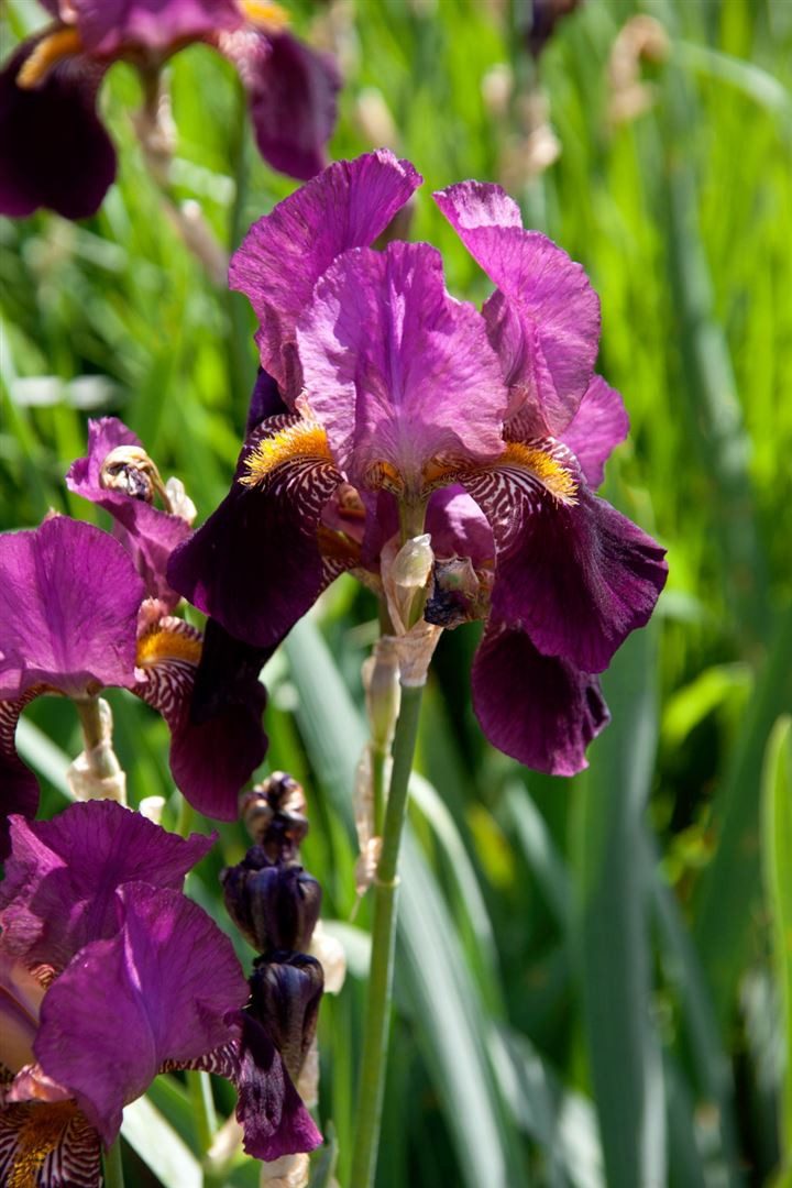 Iris × barbata-elatior ‘Senlac’, die Hohe Bart-Iris bzw. Hohe Bart-Schwertlilie, ist eine edle Blütenstaude mit außergewöhnlicher Farbtiefe. Ihre großen, gewellten Blüten zeigen ein samtiges Purpur-Burgunder mit fast schwarzem Schimmer; der kontrastierende, orange- bis goldfarbene Bart setzt ein leuchtendes Highlight. Die Blütezeit liegt je nach Lage von Mai bis Juni und verleiht Beeten und Rabatten zur Vorsommerzeit eine luxuriöse Note. Das aufrechte, horstige Wachstum und die schwertförmigen, blaugrünen Blätter sorgen auch außerhalb der Blüte für eine klare, strukturierende Optik im Staudenbeet. Als vielseitige Gartenstaude eignet sich ‘Senlac’ hervorragend für sonnige Beete, den Bauerngarten, die gemischte Rabatte und den Steingarten, kommt aber ebenso als Solitär im Vorgarten oder als elegante Kübelpflanze auf Terrasse und Balkon zur Geltung. In Gruppenpflanzung intensiviert sich der Farbeindruck, während einzelne Exemplare als markanter Blickfang wirken. Ideal ist ein vollsonniger Standort mit sehr gut drainiertem, eher magerem bis durchlässigem, gerne kalkhaltigem Boden; Staunässe und Winternässe sollten vermieden werden, damit die Rhizome gesund bleiben. Pflanzt man diese flach, mit leicht sichtbaren Rhizomen, danken es die Pflanzen mit reicher Blüte. Pflegeleicht und langlebig benötigt die Bart-Iris nur wenig Nährstoffnachschub; nach der Blüte werden die Stiele zurückgeschnitten. Eine Teilung der Horste im Spätsommer alle drei bis vier Jahre erhält Blühfreude und Vitalität. Als haltbare Schnittblume bringt ‘Senlac’ zudem dramatische Farbe in die Vase.