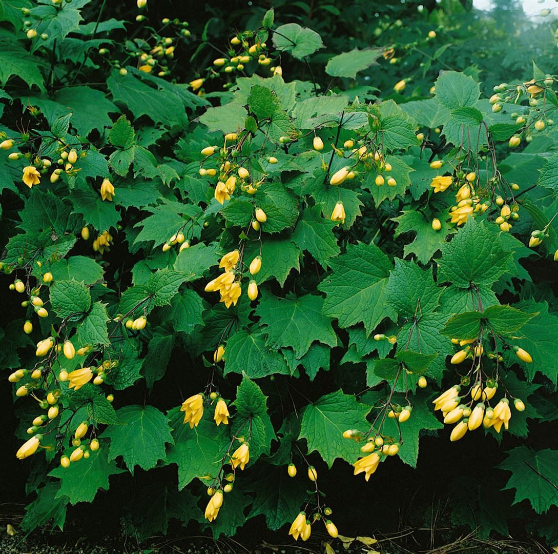 Zierstaude mit nickenden hellgelben Gloeckchen von August bis Oktober und dekoratives ahornaehnliches Laub