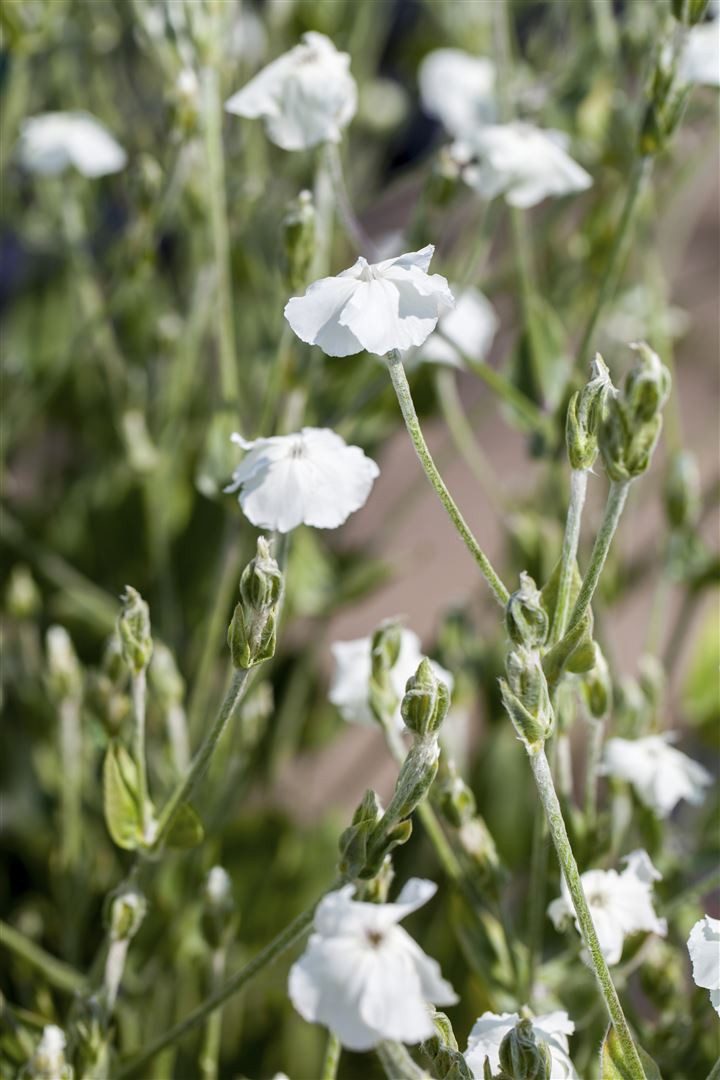 Lychnis coronaria ‘Alba’, die weiße Kronen-Lichtnelke, auch als Vexiernelke oder Samtnelke bekannt, ist eine charakterstarke Gartenstaude, die mit schneeweißen, tellerförmigen Blüten und silbrig-grauem, samtigem Laub sofort ins Auge fällt. Die horstige, locker aufrechte Wuchsform bringt von Juni bis August eine Fülle eleganter Blüten an schlanken Stielen hervor, die über der graufilzigen Blattrosette zu schweben scheinen und Beetkompositionen eine lichte, zeitlos romantische Note verleihen. Als robuste Zierpflanze passt Lychnis coronaria ‘Alba’ hervorragend in das Staudenbeet, den Bauerngarten und Steingarten sowie in Präriepflanzungen; sie wirkt als Solitär ebenso stimmig wie in kleinen Gruppen und lässt sich auf Terrasse und Balkon in größeren Gefäßen als dekorative Kübelpflanze kultivieren. In Kombination mit Ziergräsern, Lavendel, Salvia oder blauviolett blühenden Stauden entstehen reizvolle Farbkontraste, die den edlen Weißton zusätzlich betonen. Ein vollsonniger bis licht halbschattiger Standort mit gut durchlässigem, eher magerem, sandig-lehmigem Boden begünstigt eine reiche und lang anhaltende Blüte; Staunässe sollte vermieden werden. Die kurzlebige, doch äußerst zuverlässige Gartenstaude erhält sich durch maßvolle Selbstaussaat oft selbst im Beet und bleibt so über Jahre präsent. Ein Rückschnitt verwelkter Blüten fördert eine Nachblüte und hält die Pflanze kompakt, der Hauptschnitt erfolgt im Spätherbst oder zeitigen Frühjahr. Lychnis coronaria ‘Alba’ ist pflegeleicht, trockenheitsverträglich nach Etablierung und eine ideale Wahl für pfiffige Beetakzente im Vorgarten, als füllige Begleiterin in der Gruppenpflanzung oder als puristische Akzentpflanze im modernen Garten.