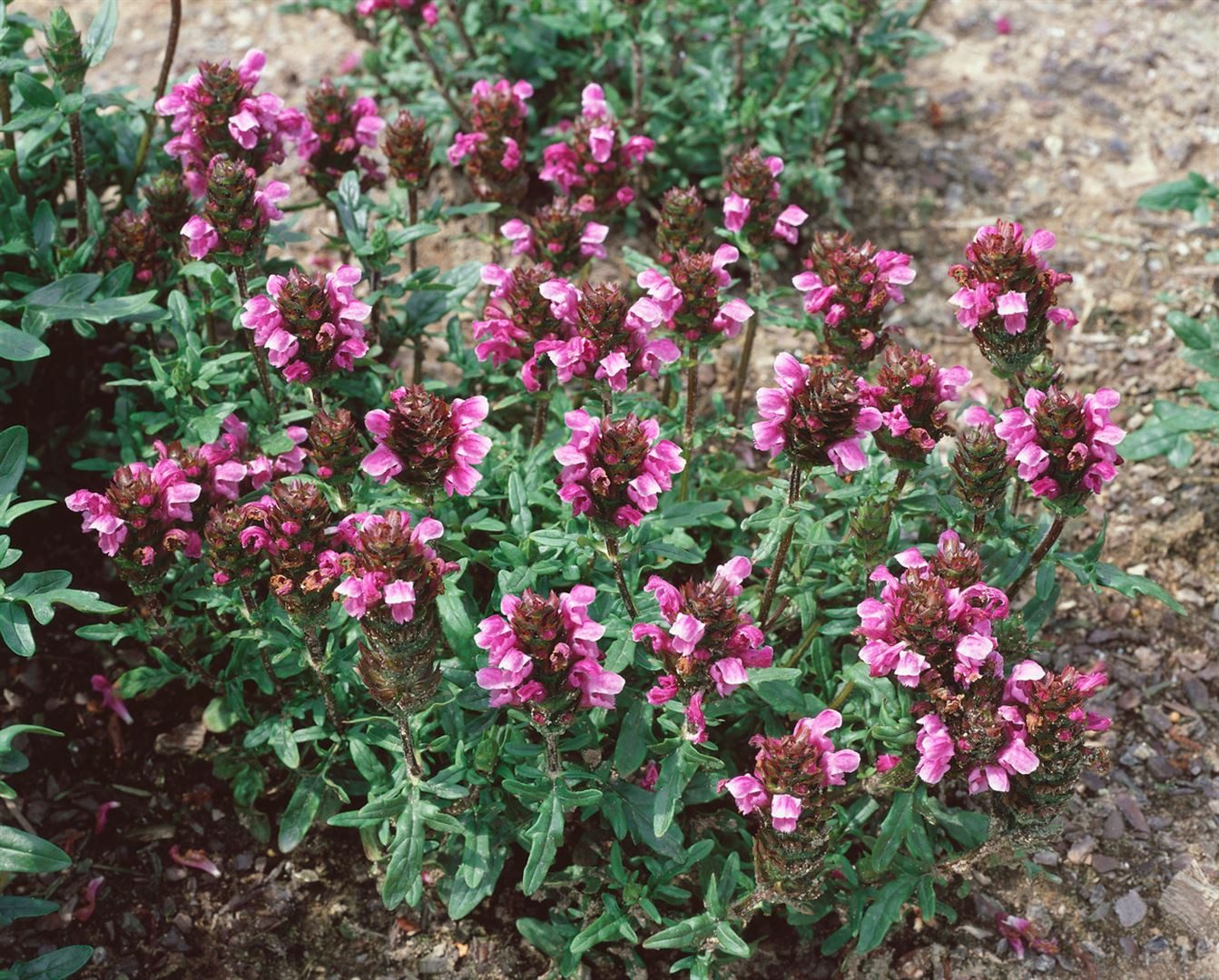 Prunella vulgaris, die Kleine Braunelle oder Gemeine Braunelle, ist eine attraktive, bodendeckende Gartenstaude, die mit zierlichen, violettblauen bis purpurfarbenen Blütenähren von Juni bis September begeistert. Als niedrige Polsterstaude bildet sie dichte Teppiche aus frischem, mittelgrünem Laub und wächst kriechend bis locker horstig zu 10–15 cm Höhe heran, wodurch sie sich ideal als Bodendecker, Rasenersatz am Beetrand und pflegeleichte Beetstaude eignet. Die zahlreichen Blüten stehen über dem Laub und sorgen über Wochen für Farbe im Staudenbeet, im Steingarten und entlang von Wegen und Rasenkanten, während der kompakte Wuchs die Pflanze auch für Schalen, Tröge und kleine Kübel auf Balkon oder Terrasse interessant macht. Als vielseitiger Zierstaude und Gartenpflanze passt Prunella vulgaris in den Vorgarten, in naturnah gestaltete Rabatten ebenso wie in formale Pflanzungen, wo sie als flächiger Bodenschmuck zwischen höheren Ziersträuchern, Gräsern und Stauden harmoniert oder in Gruppenpflanzung dichte, geschlossene Teppiche bildet. Ein sonniger bis halbschattiger Standort fördert die reiche Blüte; der Boden sollte humos, frisch bis mäßig feucht und gut durchlässig sein, verträgt aber auch magerere, leicht lehmige Substrate. Nach der ersten Blüte ein leichter Rückschnitt regt eine zweite Blütenwelle an und hält den Teppich kompakt. Prunella vulgaris ist robust, winterhart und schnittverträglich, kommt mit zeitweiser Trockenheit zurecht und überzeugt als unkomplizierter, rasch deckender Bodendecker, der Beete, Rasenfugen und Wegränder optisch aufwertet.
