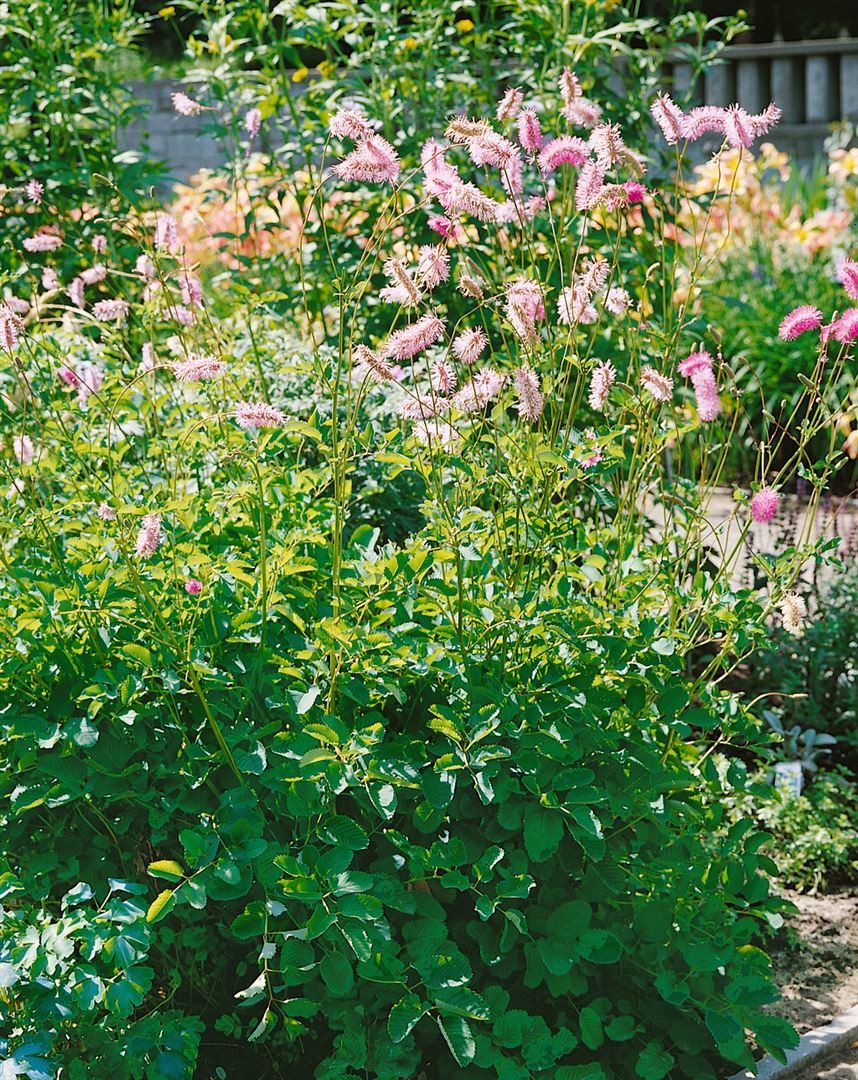 Sanguisorba obtusa hat rosa flaschenbuerstenartige Blueten von Juni bis August und bietet einen lang anhaltenden Flor mit hohem Zierwert