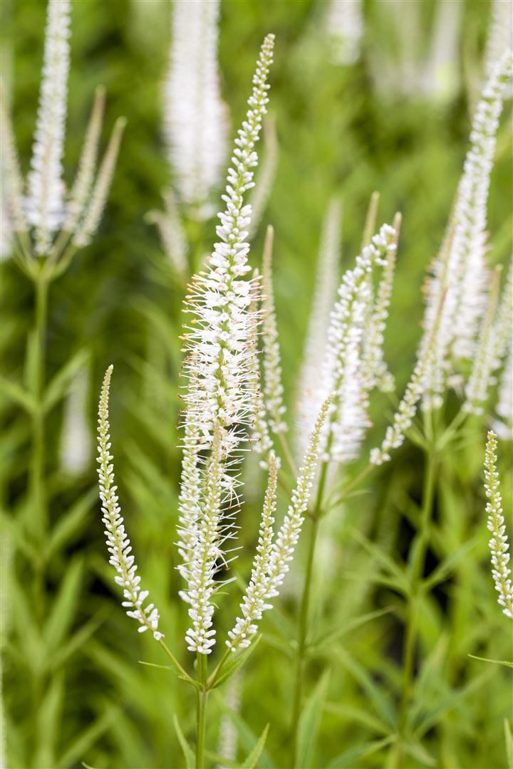 Veronicastrum virginicum Album mit reinen langen weissen Bluetenkerzen von Juli bis September mit starker Vertikalwirkung im Staudenbeet