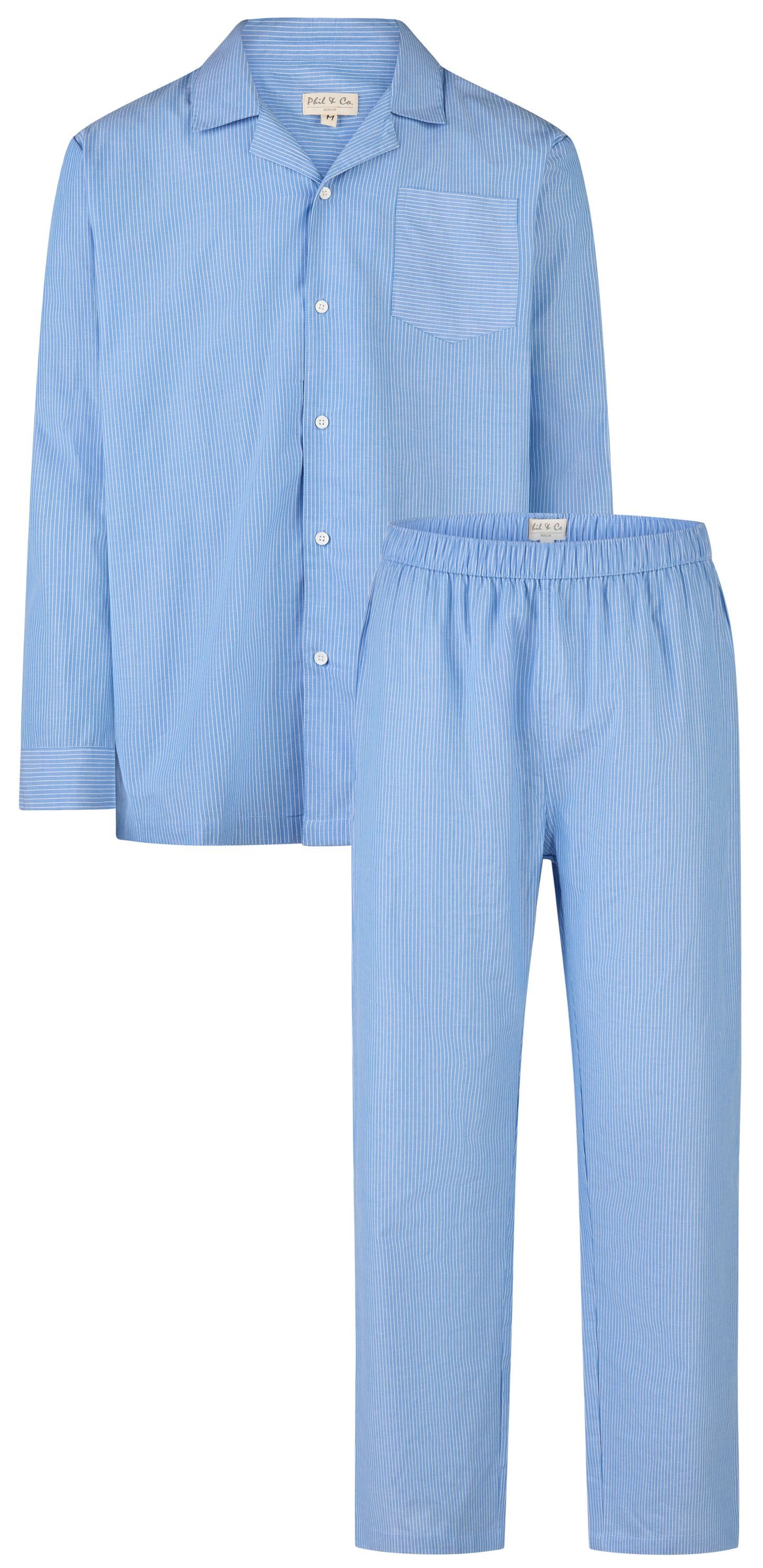 Das Oberteil des Schlafanzugs ist in einem klassischen Blau mit dezenten weißen Streifen gehalten, was ihm ein zeitloses und stilvolles Aussehen verleiht. Es ist durchgeknöpft, was das An- und Ausziehen erleichtert und für eine flexible Passform sorgt. Die langen Ärmel bieten zusätzliche Wärme und Komfort, besonders in kühleren Nächten. Eine kleine Brusttasche bietet Platz für kleine Gegenstände und verleiht dem Oberteil einen modischen Touch. Der Reverskragen rundet das elegante Design ab und verleiht dem Schlafanzug eine besondere Note.