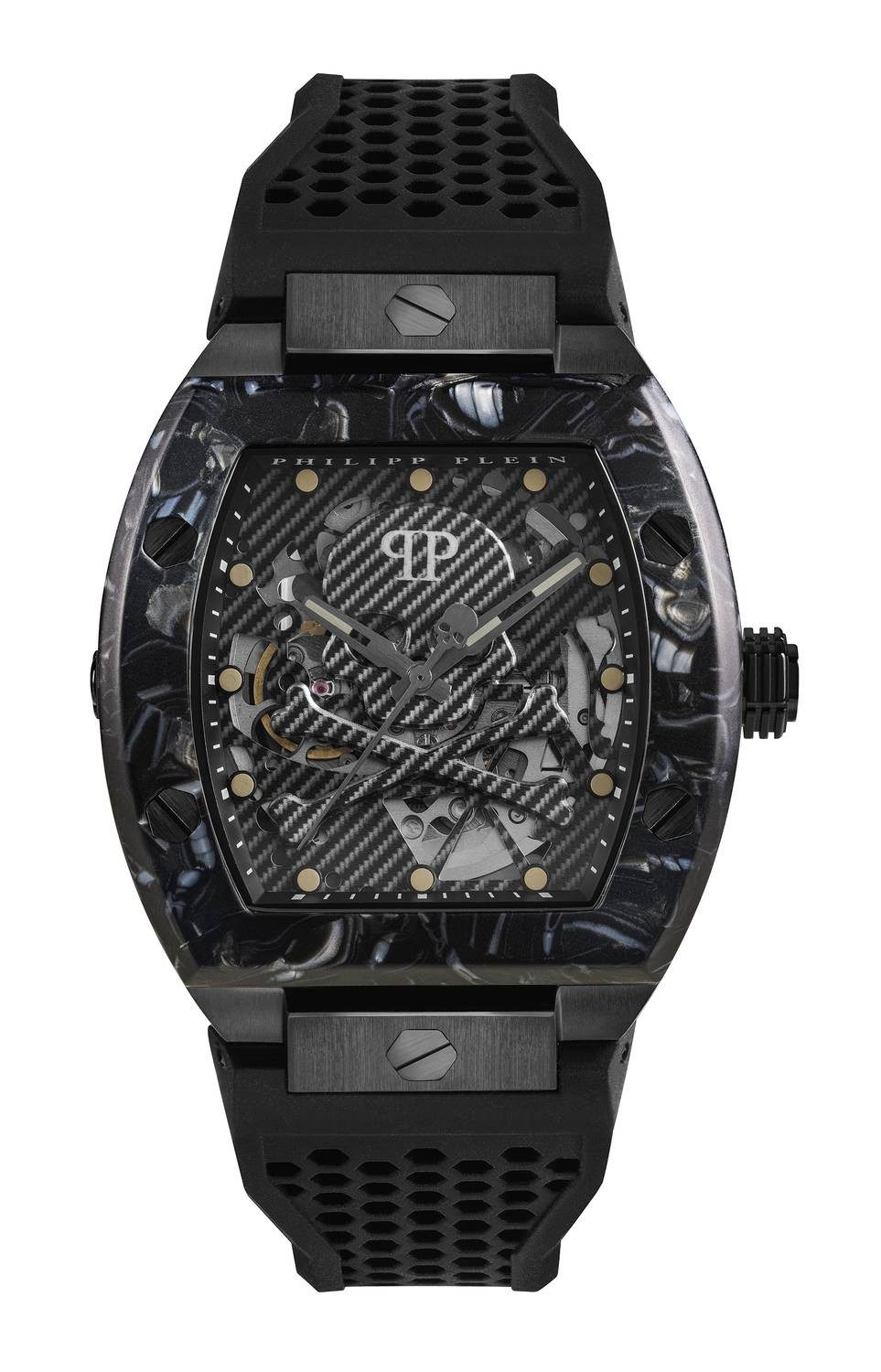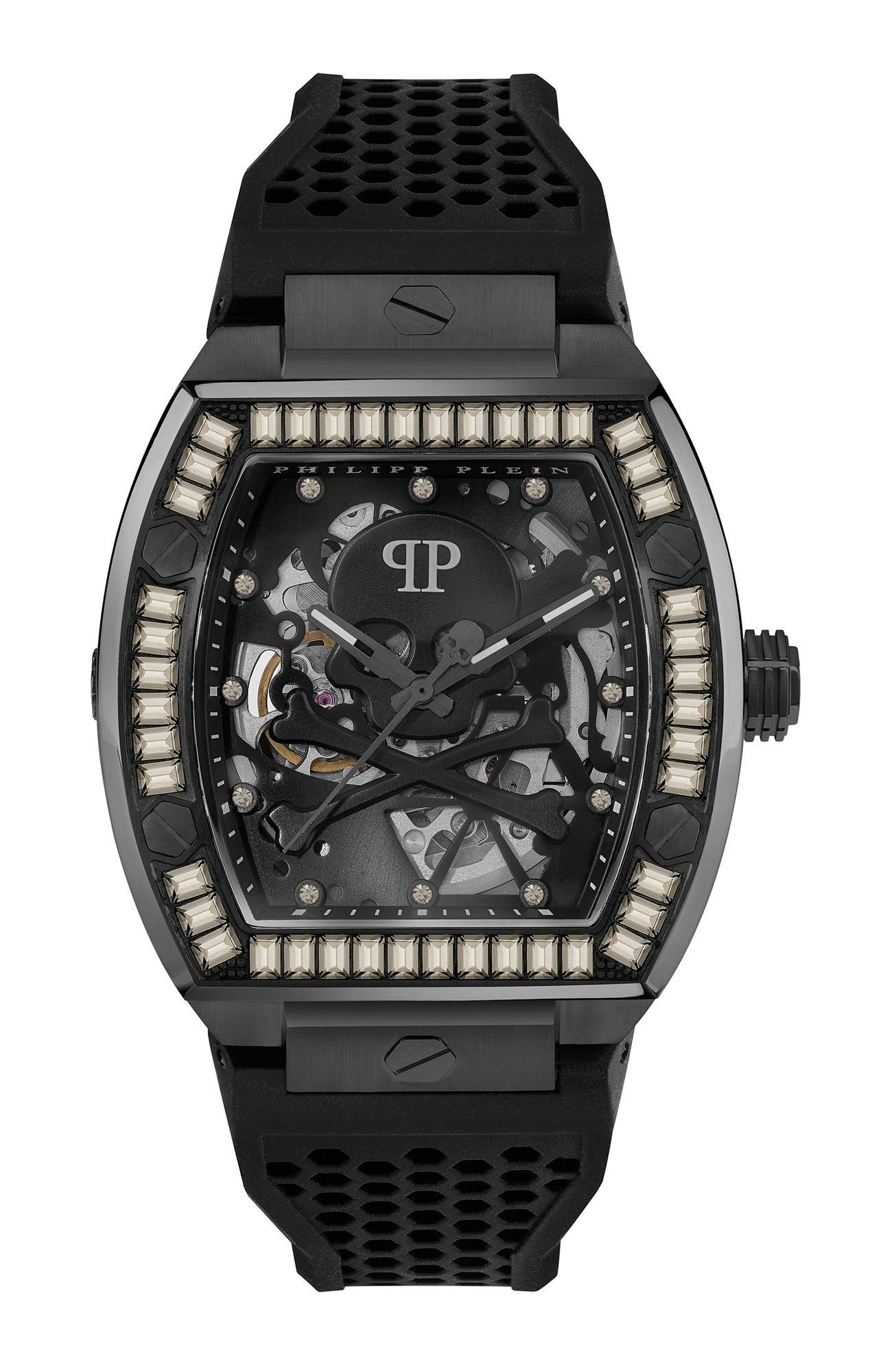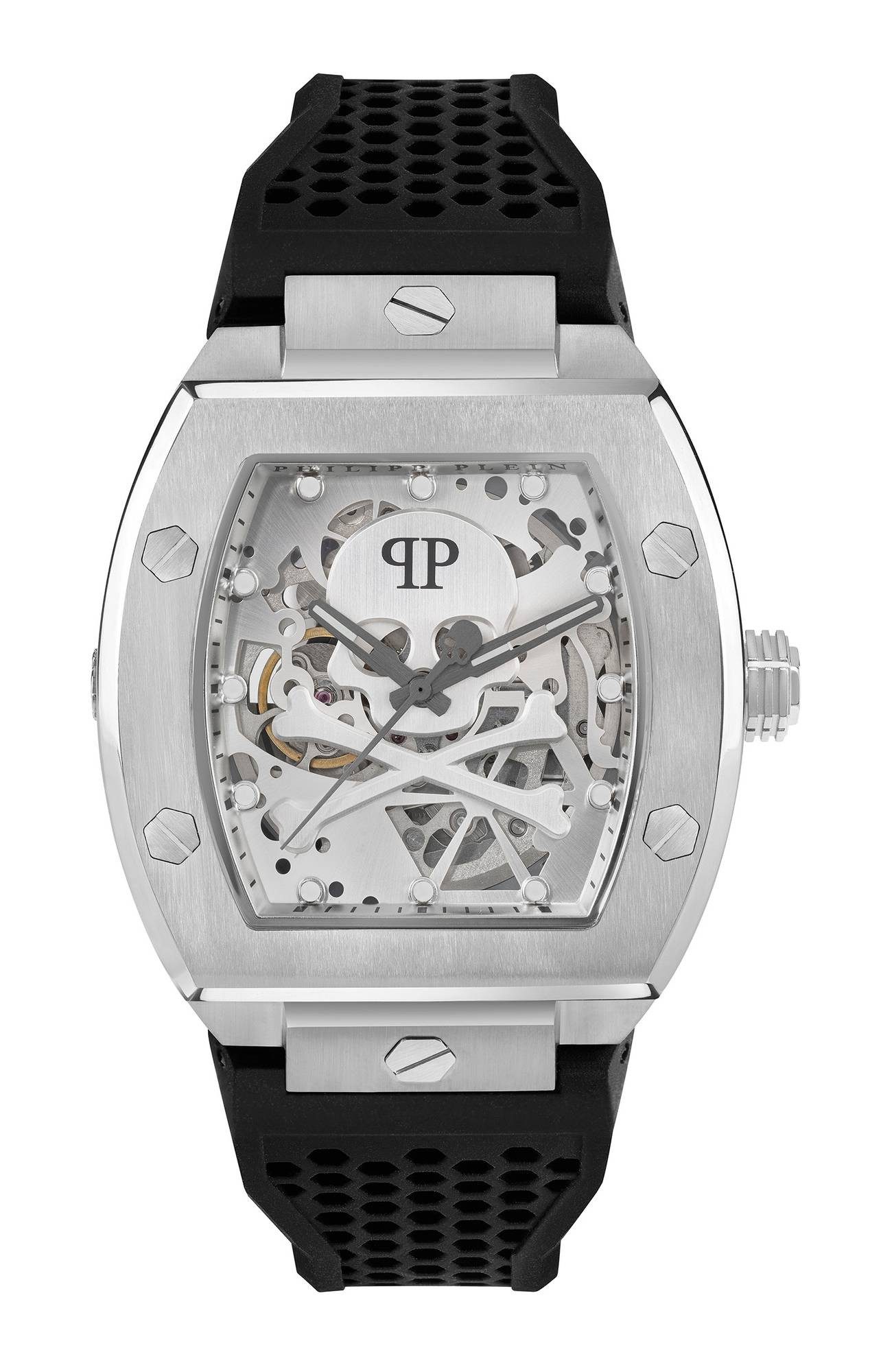 Mit Philipp Plein Uhren trägst du Luxus pur am Handgelenk. Diese Zeitmesser kombinieren mutige Designs mit exklusiven Materialien und sorgen dafür, dass du immer im Mittelpunkt stehst. Ein echter Hingucker für alle, die gerne aus der Masse herausstechen. Diese Edelstahl-Herrenuhr an einem langlebigen und bequemen Silikon-Band ist für alle gedacht, die es sportlich und robust lieben. Die Philipp Plein The Skeleton hat ein gelbgoldenes Gehäuse, ein Armband in Weiß und ein graues Ziffernblatt. Für eine edgy Note sorgt das eckige Gehäuse. Ein Automatikwerk garantiert zuverlässige Präzision. Durch die Leuchtzeiger ist das Ablesen der Uhrzeit auch bei schlechten Lichtverhältnissen einfach. Die Skelettierung verleiht dem Zeitmesser einen besonderen Charme und macht ihn zu einem echten Hingucker - außerdem kannst du dem Uhrwerk dank ihr jederzeit bei seiner tickenden Arbeit zuschauen. Das verwendete Mineralglas bietet eine gute Sicht und ist widerstandsfähig gegen alle Einflüsse, die bei normalem Gebrauch entstehen. Durch das Sichtfenster im Gehäuseboden kann man die faszinierende Arbeit des Uhrwerks beobachten. Dank einer Wasserdichte von bis zu 5 Bar kann dieser Zeitmesser unbesorgt beim Händewaschen und Baden am Handgelenk bleiben. Mit der Dornschließe lässt sich das Armband leicht anlegen und sicher verschließen. Kurzum: Die Philipp Plein The Skeleton Herrenuhr ist besonders chic und präzise gefertigt – die perfekte Wahl für alle, die ein zuverlässiges Fashion-Statement fürs Handgelenk suchen.