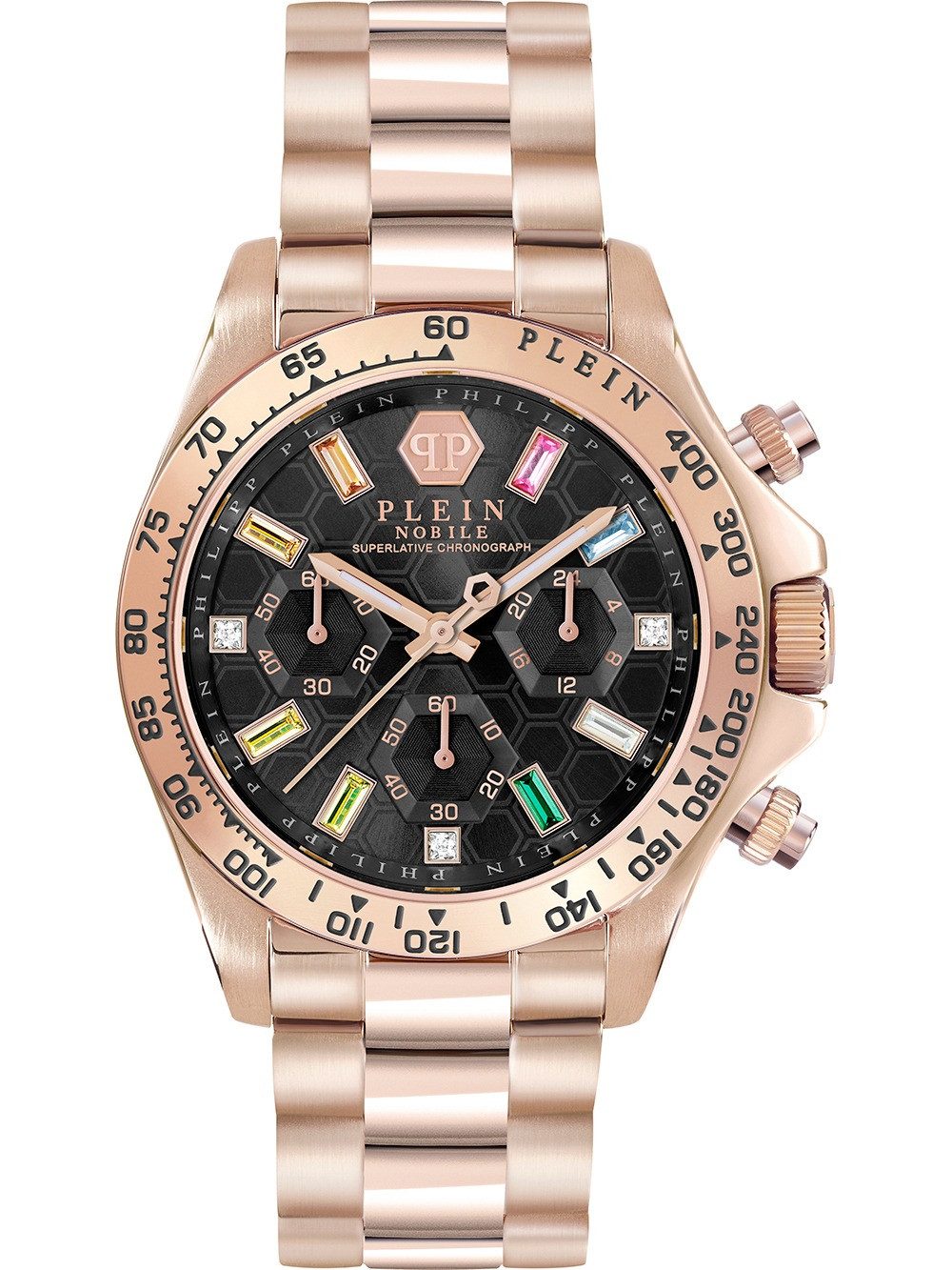 Mit Philipp Plein Uhren trägst du Luxus pur am Handgelenk. Diese Zeitmesser kombinieren mutige Designs mit exklusiven Materialien und sorgen dafür, dass du immer im Mittelpunkt stehst. Ein echter Hingucker für alle, die gerne aus der Masse herausstechen. Die Philipp Plein Nobile Chronograph ist ein sportiver Chronograph für Frauen, die bei Stil und Qualität keine Kompromisse machen wollen. Das Edelstahlgehäuse und das Metallband bieten einen sportlichen Look vom Office bis in die Freizeit. Die Farbgebung komplett in Silber lässt die Philipp Plein Nobile Chronograph im angesagten Monochrome Look erstrahlen. Der kühle Glanz mit dem runden Gehäuse ist immer eine stilsichere und edle Wahl. Über allem liegt ein schützendes Mineralglas. Typische Hilfsziffernblätter sorgen bei diesem Chronographen für die sportliche Optik und präzise Funktion. Das Metall-Band wird mit einer Butterfly-Faltschließe sicher am Handgelenk fixiert. Bei einer Wasserdichte von bis zu 5bar ist die Uhr vor dem Eindringen von Feuchtigkeit bestens geschützt. Gleichzeitig sorgt das Quarz-Werk für Präzision. Ob für den Alltag oder den besonderen Moment – dieser Zeitmesser von Philipp Plein passt sich deinem Leben an und unterstreicht deine Freiheit, die Zeit nach deinen Regeln zu gestalten.
