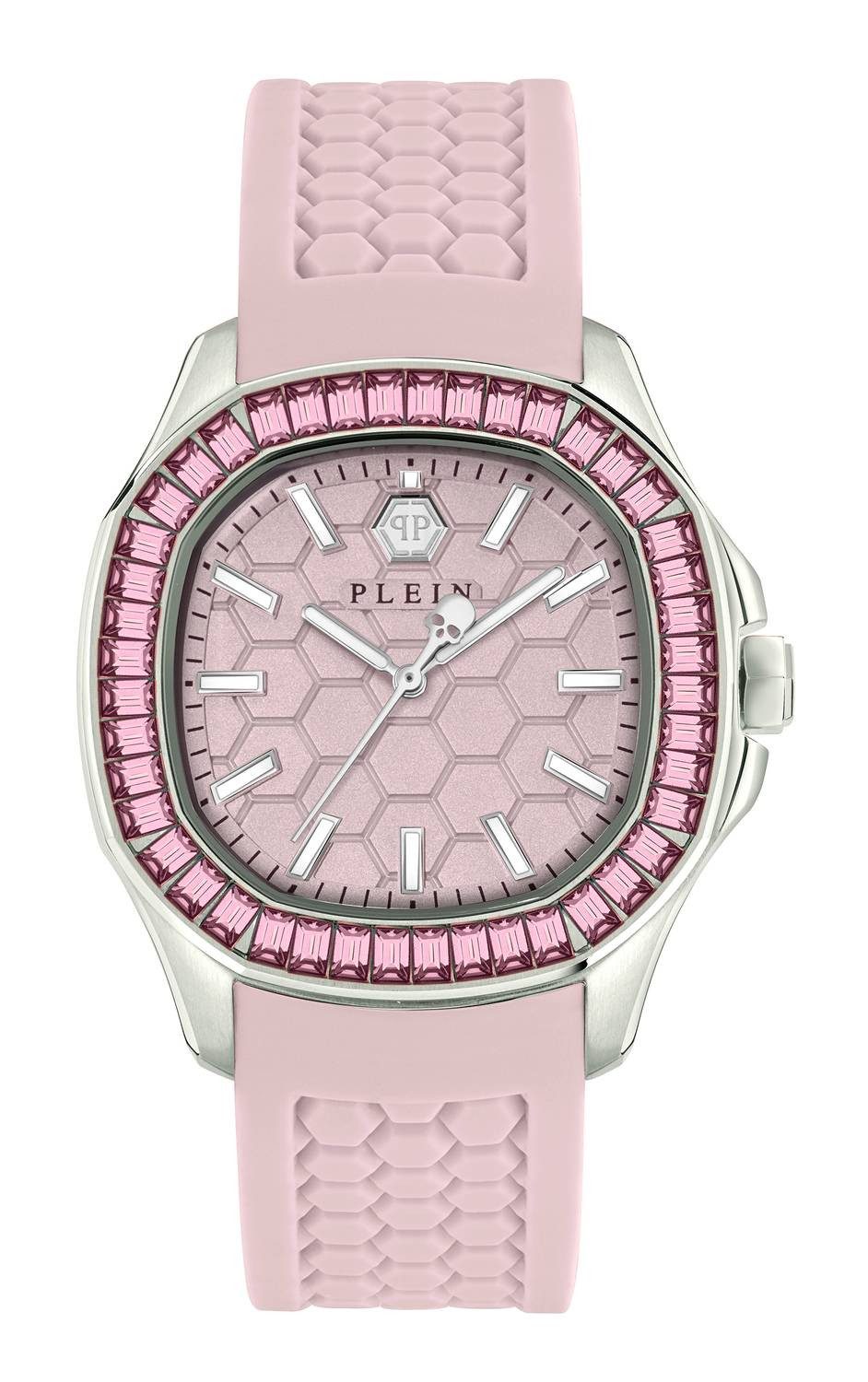 Das ikonische sechseckige Muster, das auf der gesamten Uhr eingraviert ist - auf dem Hintergrund des Zifferblatts und auf dem Silikonarmband -, ist Ausdruck einer starken und unverwechselbaren Plein-DNA.