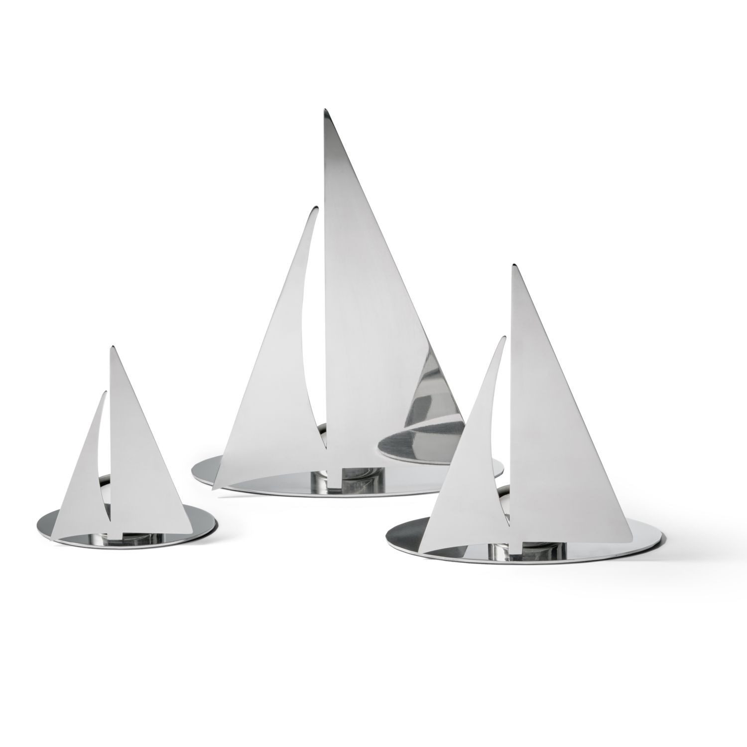 Ob einzeln oder als Flotte, das Regatta-Windlicht aus hochglänzend poliertem Edelstahl verströmt immer und überall maritimes Flair! Es ist für den Gebrauch mit einem herkömmlichen Teelicht ausgelegt, dessen Schein sich in der silbern glänzend Oberfläche des kleinen Segelsbootes widerspiegelt und einen angenehmen Schein ausstrahlt. Der Teelichthalter ist in drei Größen erhältlich, in der großen Version ist er 23 cm hoch und 18 cm lang.