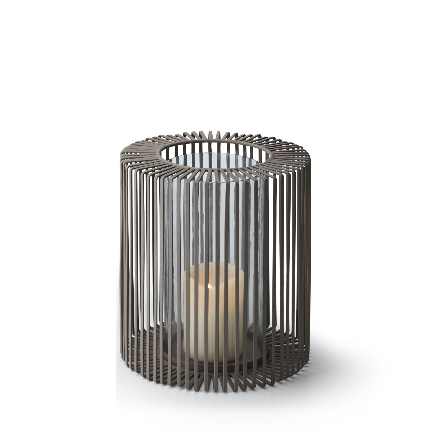 Das Windlicht Oslo ist auch ohne Beleuchtung ein echter Hingucker, aber erst bei Dämmerung entfaltet es seine ganze Wirkung. Sobald dann nämlich eine Kerze in seine Mitte gestellt wird, entsteht durch die dünnen Streben aus pulverbeschichtetem Stahl ein Schattenspiel, bei dem es nie langweilig wird zuzusehen. Dabei schützt der passende Glaseinsatz die Blockkerze vor Wind, damit ist das Windlicht bestens für den Außenbereich geeignet. Ein Bodeneinsatz fängt Kerzenwachs auf, sollte doch einmal etwas danebengehen. Das Hohe Windlicht Oslo ist in zwei Größen erhältlich, in der kleinen Варианты ist es 23 cm hoch und hat einen Durchmesser von 21 cm.