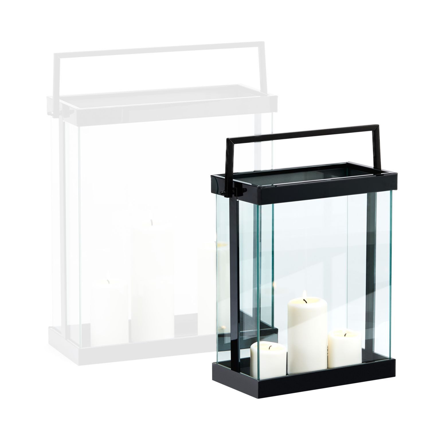 Wie von einem Architekten entworfen überzeugt die Laterne Luxor durch hochwertige Materialien und strenge Linien. Sie ist mit einem Tragegriff ausgestattet, mit sie auch mit nach draußen genommen und so an langen Sommerabenden Licht spenden kann. Ihre rechteckige Form sowie das Gewicht von 3,75 kg machen sie sehr standsicher, zudem passen mehrere Stumpenkerzen in ihr Inneres, die den Wohnbereich erleuchten. Die Laterne Luxor besteht aus Edelstahl, schwarzem Nickel und gehärtetem Glas. In der Размер S ist sie 42 cm hoch, 15 cm breit und 32 cm lang.