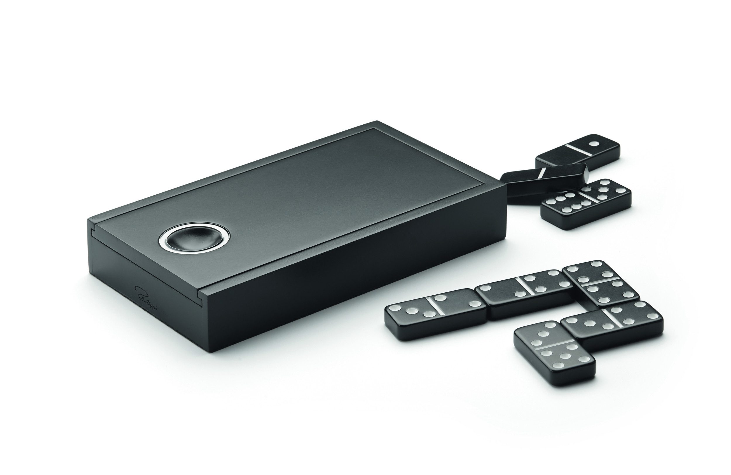 Anders als bei Dame, Schach oder Backgammon benötigen Domino-Kontrahenten nicht einmal ein Spielfeld. Die stylischen Steine aus seidenmatt schimmerndem Urea-Kunststoff lassen sich auf praktisch jeder x-beliebigen Unterlage aneinanderreihen. Dank der magnetisch schließenden Holzbox aus Buche ist das Set gelegentlich auch als Reisebegleiter unterwegs. Ein Zeitvertreiber, der mit taktischem Geschick Wartezeiten verkürzt und beizeiten sogar Kindern hilft, logisches Denken und Interaktion zu verbessern. überall, wo die funktionale Box mit Griffmulde und Schieberegler auftaucht, ist es bis zum Domino-Effekt auch nicht mehr weit.