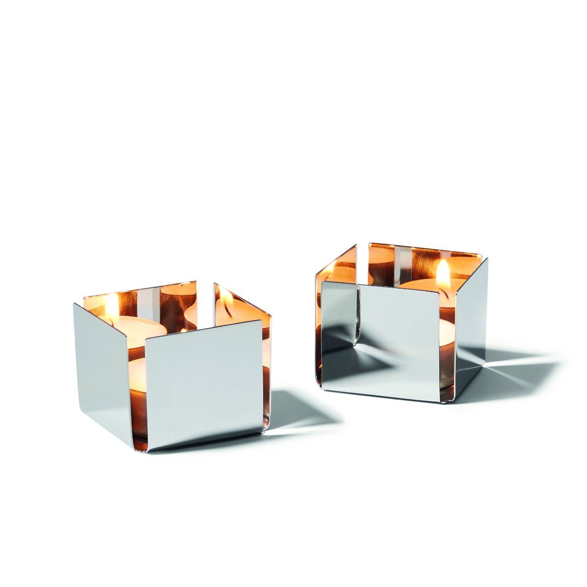 Setzen Sie gemütliche Akzente in Ihren Wohnräumen mit den beiden Teelichthaltern PEP von Philippi. Die hochglanzpolierten Oberflächen der Würfel aus Edelstahl reflektieren den Kerzenschein innen und außen auf einzigartige Weise. Durch die seitlichen Schlitze der kleinen Quadrate wird die Umgebung in ein bezauberndes Lichtspiel getaucht. Die offene, geometrische Form wirkt harmonisch und modern.