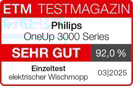 Das Testmagazin „ETM“ testet den Philips OneUp 3000 Series im Einzeltest. Das Gerät reinigt hervorragend, auch an Ecken und Kanten. Der Akku ist sehr ausdauernd. Всеrdings lädt er relativ „langsam“. Der elektrische Wischmopp ist „flexibel zu verwenden“. Die Bedienung ist einfach. Außerdem punktet das sehr leise Betriebsgeräusch. Das Modell erreicht die Gesamtnote „sehr gut (92,0 %)“.