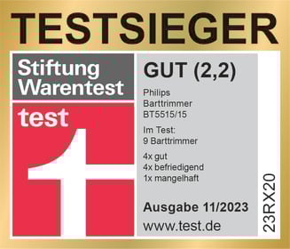 Das Magazin „test“ der „Stiftung Warentest“ testet den Philips Beardtrimmer series BT5515/15 im Vergleich mit insgesamt neun Barttrimmern. Das Gerät trimmt und stylt den Bart „gut“. Auch die „gute“ Hautschonung überzeugt. Die Handhabung ist einfach: Z. B. klappen die Bedienung, der Austausch von Kammaufsätzen, das Einstellen und das Reinigen problemlos. Außerdem punktet die „gute“ Lebensdauer. Mit dem Gesamtergebnis „GUT (2,2)“ ist der Barttrimmer der „TESTSIEGER“. Er bietet das „beste Gesamtpaket“.