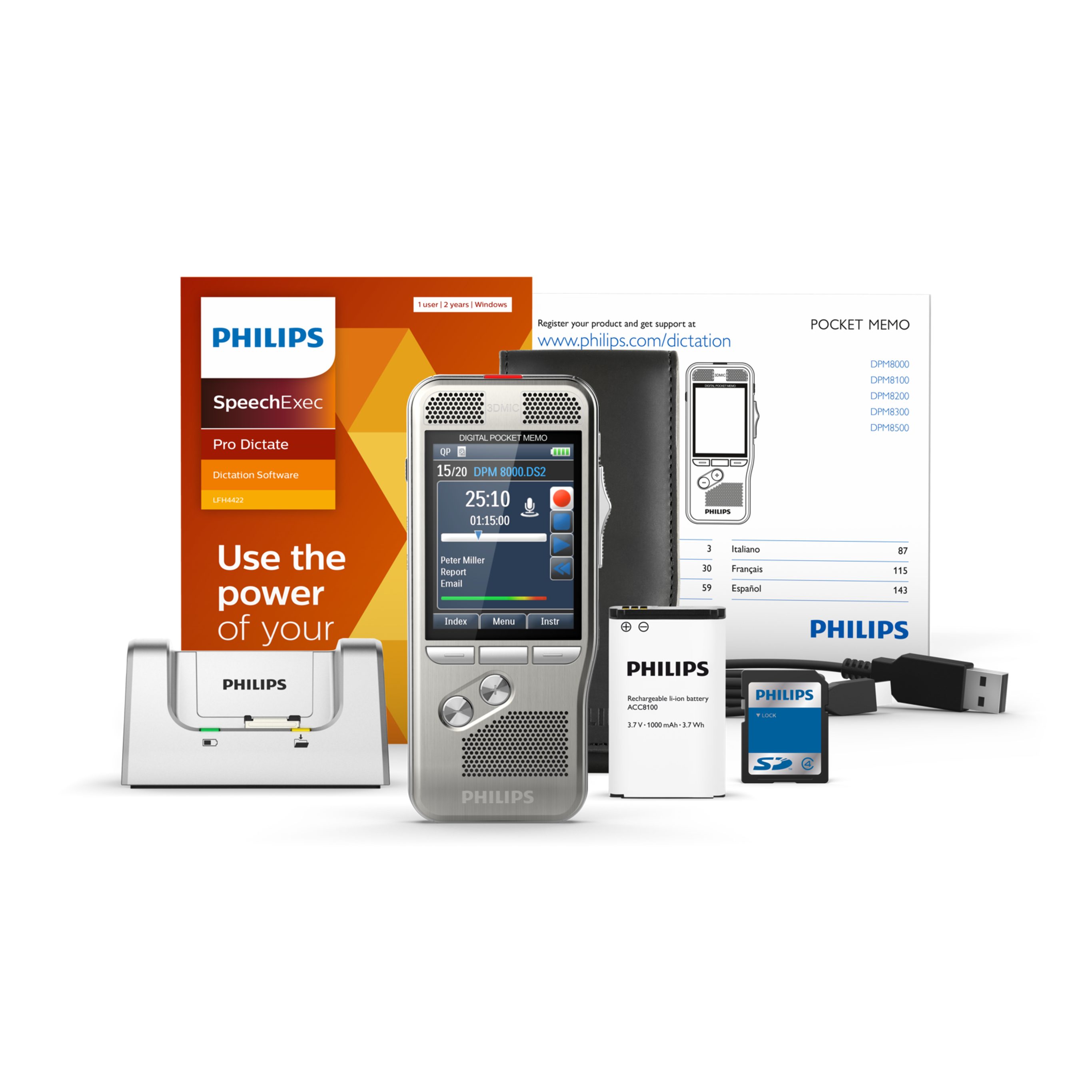 Lieferumfang | PocketMemo Diktiergerät Dockingstation, Speicherkarte 16 GB, Akku, USB-Kabel, Tasche, SpeechExec Pro Diktiersoftware (2-Jahres-Abo inkludiert), Benutzerhandbuch |