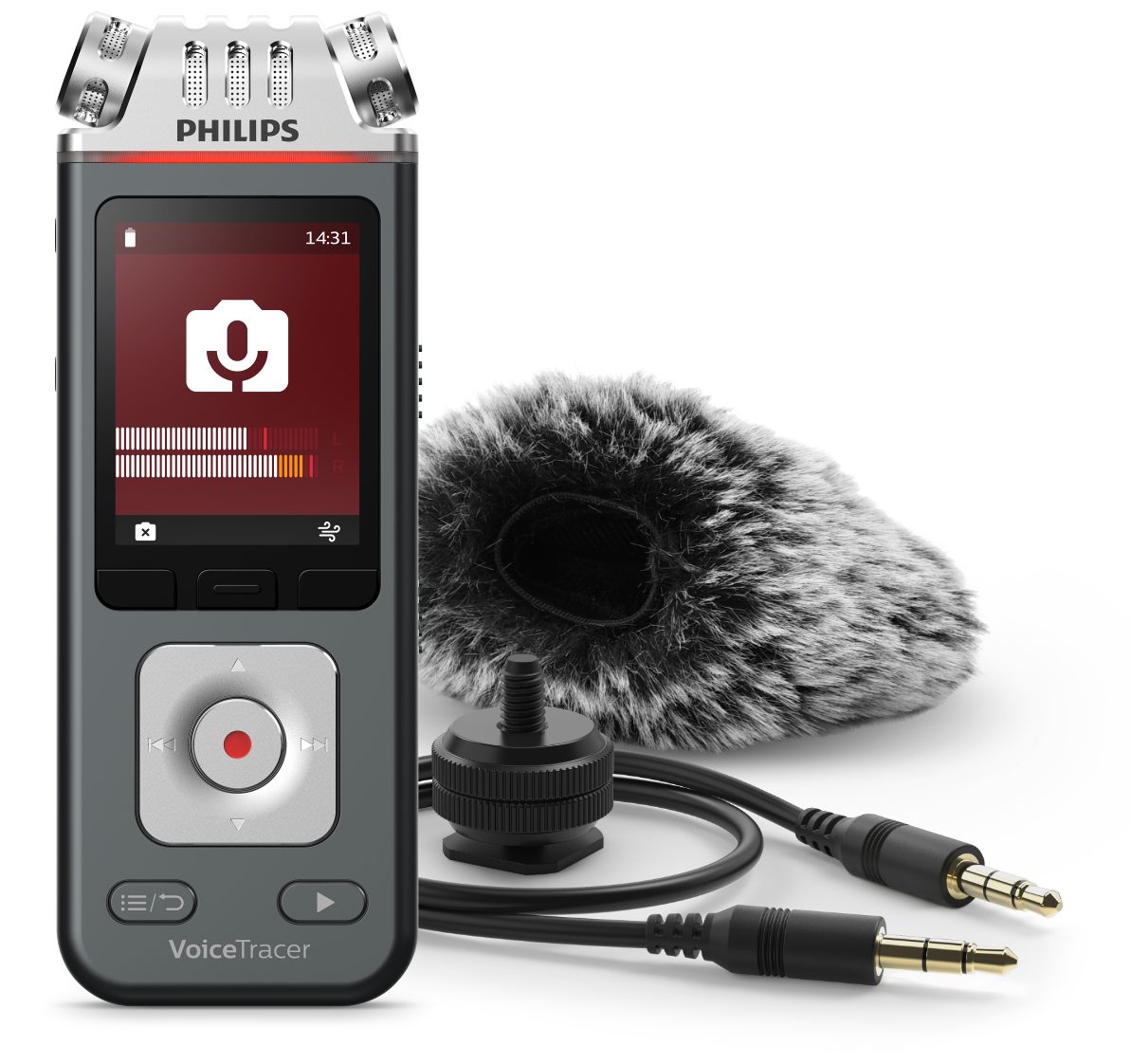 Lieferumfang | Philips DVT7110 Audio Recorder Audioverbindungskabel (3,5-mm-Stecker/Stecker, Stereo) Hot-Shoe-Adapter Windschutz USB-C-Kabel Kurzanleitung |