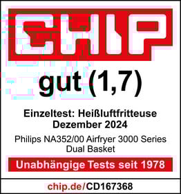 Das Onlinemagazin „CHIP.de“ testet den Philips NA352/00 Steam Airfryer im Einzeltest. Die Heißluftfritteuse zeigt eine „sehr gute“ Leistung. Sie ist über viele Direkttasten und Automatik-Programme „unkompliziert“ bedienbar. Das Gerät ist „gut“ ausgestattet. Es hat zwar kein WLAN, aber u. a. zwei Fächer, die sich synchron oder unabhängig voneinander betreiben lassen. Auch das Garen bei Niedrigtemperatur ist möglich. Außerdem ist das Modell spülmaschinengeeignet. Der „günstige“ Airfryer erhält die „CHIP“-Note „gut (1,7)“.