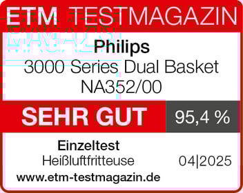 Der Philips Airfryer 3000 Series Dual Basket NA352/00 erzielt im Einzeltest des „ETM TESTMAGAZINS“ das Gesamtergebnis „sehr gut (95,4 %)“. Die „sehr gute“ Funktionalität glänzt bei Convenience Food, Fleisch- und Fischspeisen sowie bei Gemüse. Das Gerät ist sehr einfach zu bedienen und zu reinigen. Die Temperatur ist sehr gleichmäßig und das Gerät ist sehr stabil. Es ist hervorragend verarbeitet. Außerdem bietet es ein sehr großes Volumen. Insgesamt liefert das Modell ein „durchweg gelungenes Garerlebnis“.
