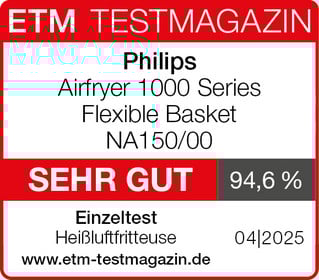 Testurteil von etm-testmagazin.de vom 28.04.2025, Ausgabe 04|2025, Seite tests/die-airfryer-1000-series-flexible-basket-na150-00-von-philips-im-test-2025/: "SEHR GUT | 94,6 %"