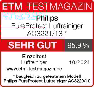 Der Philips PureProtect Luftreiniger AC3221/13 ist „baugleich zu getestetem Modell Philips PureProtect Luftreiniger AC3220/10“ und erzielt im Einzeltest des „ETM TESTMAGAZINS“ das Gesamtergebnis „sehr gut (95,9 %)“. Das Gerät filtert Grobpartikel, Feinpartikel und Gerüche auch in großen Räumen sehr zuverlässig. Es ist sehr einfach zu bedienen. Die dazugehörige App ist super. Außerdem bietet es sehr viele Funktionen. Insgesamt ist das Modell „leise, sparsam & leistungsstark“.