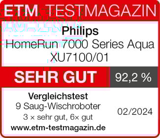 Der Philips HomeRun 7000 Series Aqua XU7100/01 erzielt im Vergleichstest des „ETM TESTMAGAZINS“ mit acht weiteren Saug- und Wischrobotern das Gesamtergebnis „sehr gut (92,2 %)“. Das Gerät reinigt sowohl auf Hart- und Teppichboden als auch in Ecken und an Kanten zuverlässig. Es weicht Hindernissen „sehr gut“ aus und erreicht die Ladestation hervorragend. Außerdem ist es sehr einfach zu bedienen und zu reinigen. Insgesamt erreicht das Modell das drittbeste Ergebnis dieses Spektrums.