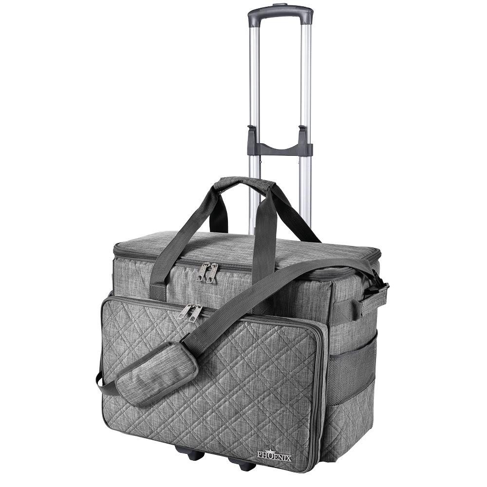 Wer seine Nähmaschine mit zu Kursen und Nähtreffen nehmen möchte, sollte die empfindliche Maschine gut vor Transportschäden schützen um möglichst lange Freude an ihr haben zu können. Für umfangreiches Nähzubehör ist Platz in den zahlreichen Taschen und Fächern, die sich hinter der Fronttasche, in der Haupttasche und an den Seiten befinden. Das entnehmbare Trolley Gestell macht den Transport von schwerem Gepäck leicht. Durch den gepolsterten Inneboden der Phönix Nähmaschinentasche werden Stöße abgedämpft, die zur Beschädigung der Maschine führen können und auch der Maschinenboden wird vor Kratzern bewahrt. Die Kunststofffüßchen am Taschenboden verhindern Verschmutzung und den direkten Bodenkontakt der Nähmaschine. Das pflegeleichte Oxford-Material, das als Deckstoff dient, ist einfach abwischbar und durch seine Festigkeit besonders robust. Auch das Innenmaterial lässt sich mit einem feuchten Tuch von Staub und grobem Schmutz befreien.
