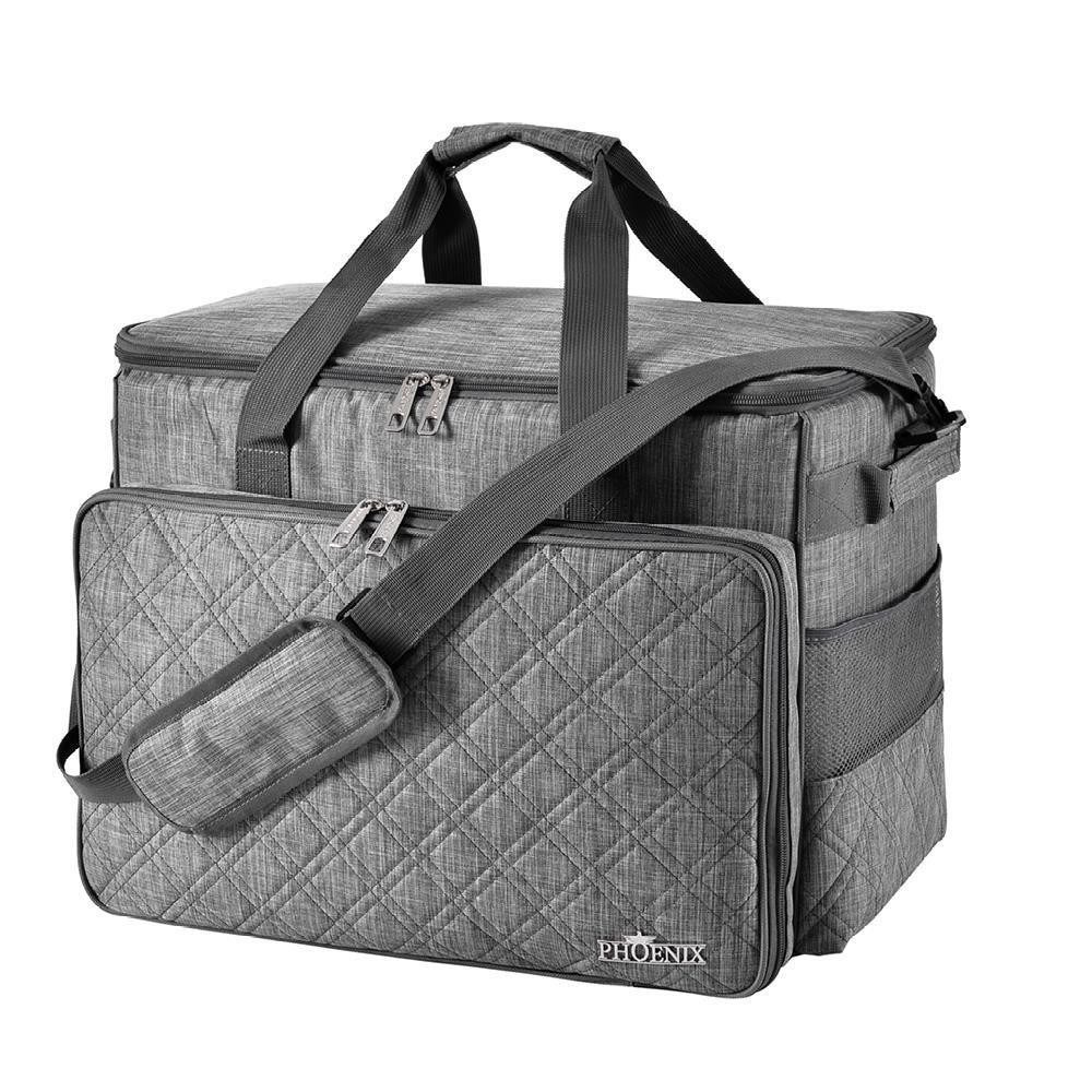 Mit ihrer gesteppten Fronttasche und dem melierten Stoff in trendigem Grau verbindet die Phönix Nähmaschinentasche Funktionalität. Ein besonderer Hingucker ist auch das elegante Phönix Logo an der Fronttasche und auch die Logodetails an den Reißverschluss-Schiebern.