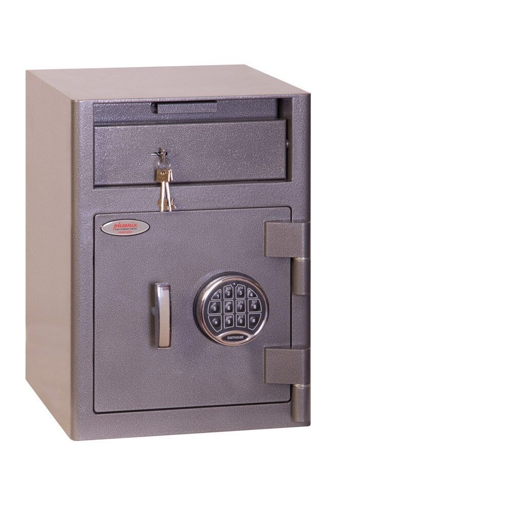 DER PHOENIX CASHIER DEPSOIT SS0996ED ist ein Frontlader-Sicherheits- und Einzahlungssafe fur die 24-Stunden-Bargeldverwaltung. SICHERHEITSSCHUTZ - Empfohlen fur eine Bargelddeckung uber Nacht von 3.000 Bargeld oder 30.000 Wertsachen. VERRIEGELUNG - SS0990ED - Ausgestattet mit einem elektronischen Hochsicherheitsschloss der VdS-Klasse II. DEPOT-EINRICHTUNG - 100 H x 415 B x 220 T - Ausgestattet mit einer speziellen Phoenix-Prallplatte, um sicherzustellen, dass der Inhalt nicht herausgefischt werden kann. Verfugt auch uber eine Nachtverriegelungsplatte fur erhohte Sicherheit ausserhalb der Geschaftszeiten. KONSTRUKTION - Hergestellt aus 12 mm Stahlblechtur und 6 mm Korpus. BEFESTIGUNG - Применить vorbereitet fur die Bodenbefestigung mit mitgelieferten Befestigungsschrauben fur Beton. FARBE - Beendet in einer hochwertigen kratzfesten graphitgrauen Farbe RAL7024.