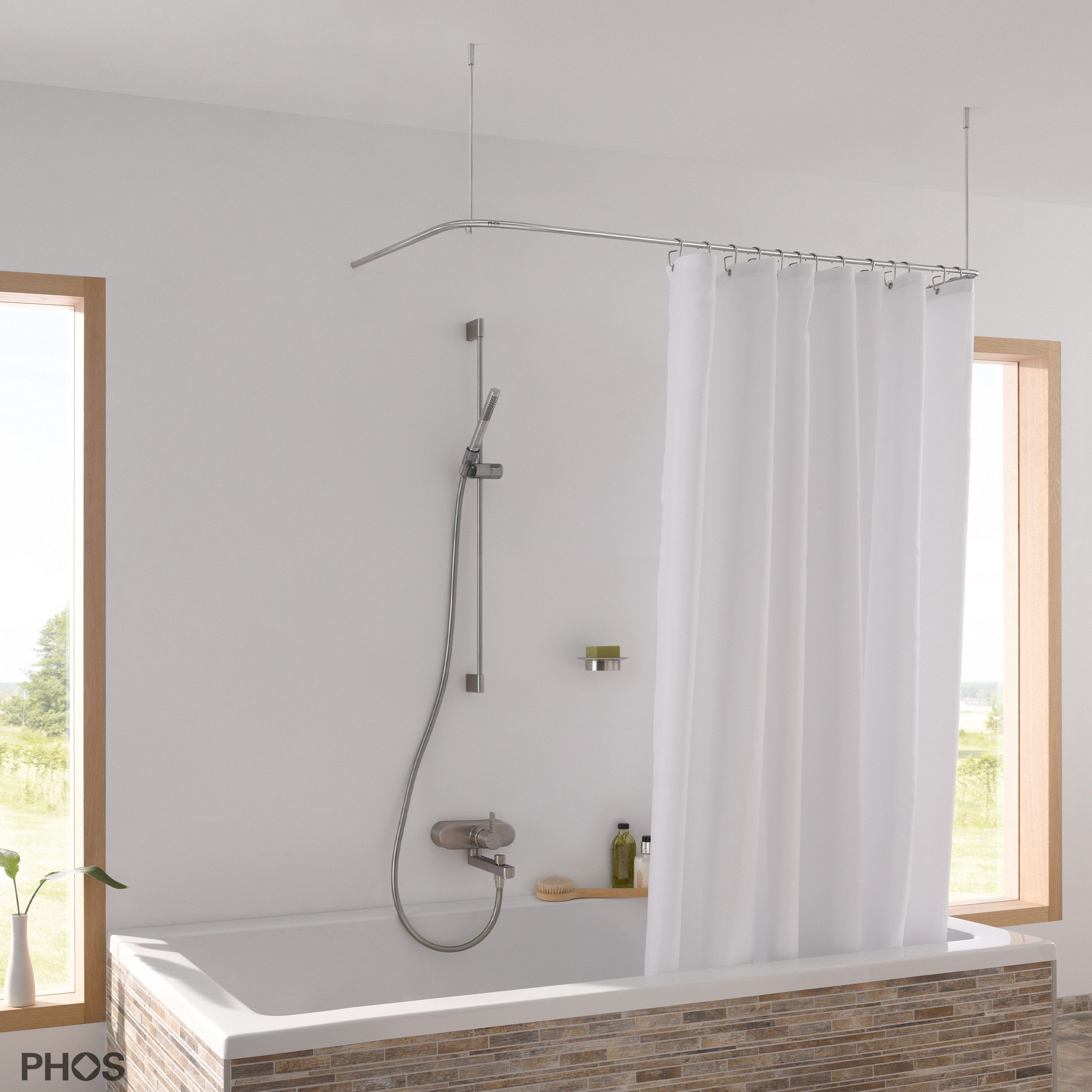 Duschvorhangstange Badewanne U-Form: 70×140×70 cm, verschraubt: Hochwertige Edelstahl-Duschvorhangstange für Badewannen in U-Form verschraubt an Wand und Decke. Schlank, stabil und bewährt in professionellen Projekten. Langlebige Vollmaterial-Konstruktion für eine effektive Duschabtrennung. Verdeckte Befestigungen ermöglichen eine zugfeste Montage. Pflegeleichte Oberfläche und angenehme Haptik. Die Deckenabhängungen sind 40 cm lang und können mit einer Metallsäge gekürzt werden. Für eine persönliche Beratung, auch für den Duschvorhang, stehen wir zur Verfügung.