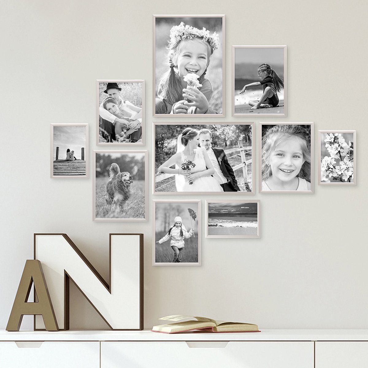 Set aus stabilen Aluminium-Bilderrahmen im modernen Stil zur Gestaltung einer individuellen Bilderwand oder Fotogalerie - Durch ihre schlichte Optik heben die Bilderrahmen Bilder hervor ohne dabei vom Motiv abzulenken. Bilderwände haben einen ganz besonderen Charme und verleihen dem eigenen Zuhause einen individuellen Charakter. Sie sind eine tolle Möglichkeit um Fotos Postkarten Zeichnungen oder andere Erinnerungsstücke an der Wand in Szene zu setzen. Die Bilderrahmen lassen sich zu unterschiedlichen Anordnungen und Arrangements kombinieren - ganz symmetrisch in einer Reihe als Raster oder locker über die Wand verteilt. Die Bilderwand lässt sich jederzeit erweitern und mit anderen Bilderrahmen-Sets ergänzen. (Motive und Dekoration sind nicht im Lieferumfang enthalten.)
