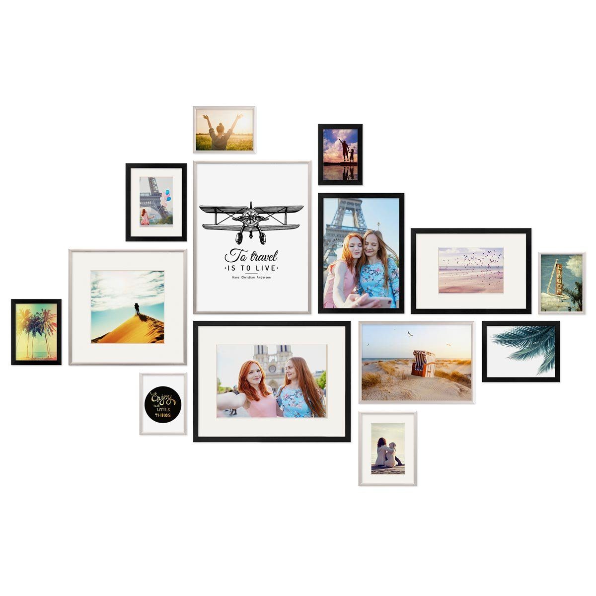 Bilderrahmen-Collage in Schwarz-Silber zur Gestaltung einer individuellen Bilderwand oder Bildergalerie - moderne Wechselrahmen aus MDF und praktisches Zubehör. Bilderwände haben einen ganz besonderen Charme und verleihen dem eigenen Zuhause einen individuellen Charakter. Sie sind eine tolle Möglichkeit um Fotos Postkarten Zeichnungen oder andere Erinnerungsstücke an der Wand in Szene zu setzen. Mit diesem Bilderrahmen-Set lässt sich eine individuelle Bilderwand einfach selbst gestalten. Die Bilderrahmen lassen sich zu unterschiedlichen Anordnungen und Arrangements kombinieren - ganz symmetrisch in einer Reihe als Raster oder locker über die Wand verteilt. Die Bilderwand lässt sich jederzeit erweitern und mit anderen Bilderrahmen-Sets ergänzen. (Motive und Dekoration sind nicht im Lieferumfang enthalten.)