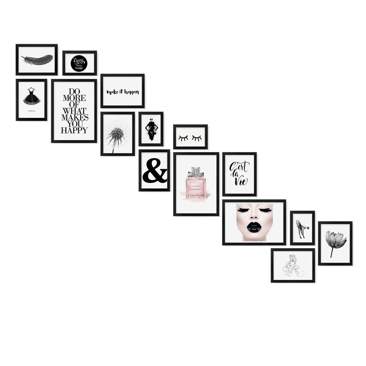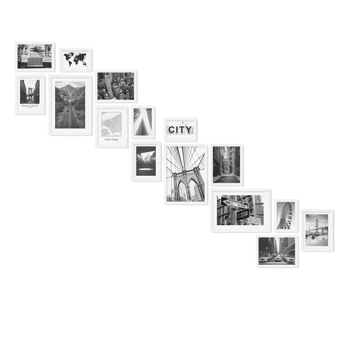 Bilderrahmen-Set in Gold zur Gestaltung einer individuellen Bilderwand im Treppenhaus oder Treppenaufgang - moderne Wechselrahmen aus MDF und praktisches Zubehör. Bilderwände haben einen ganz besonderen Charme und verleihen dem eigenen Zuhause einen individuellen Charakter. Sie sind eine tolle Möglichkeit um Fotos Postkarten Zeichnungen oder andere Erinnerungsstücke an der Wand in Szene zu setzen. Mit diesem Bilderrahmen-Set lässt sich eine individuelle Bilderwand einfach selbst gestalten. Die Bilderrahmen lassen sich zu unterschiedlichen Anordnungen und Arrangements kombinieren - ganz symmetrisch in einer Reihe als Raster oder locker über die Wand verteilt. Die Bilderwand Treppe lässt sich jederzeit erweitern und mit anderen Bilderrahmen-Sets ergänzen. (Motive und Dekoration sind nicht im Lieferumfang enthalten.)