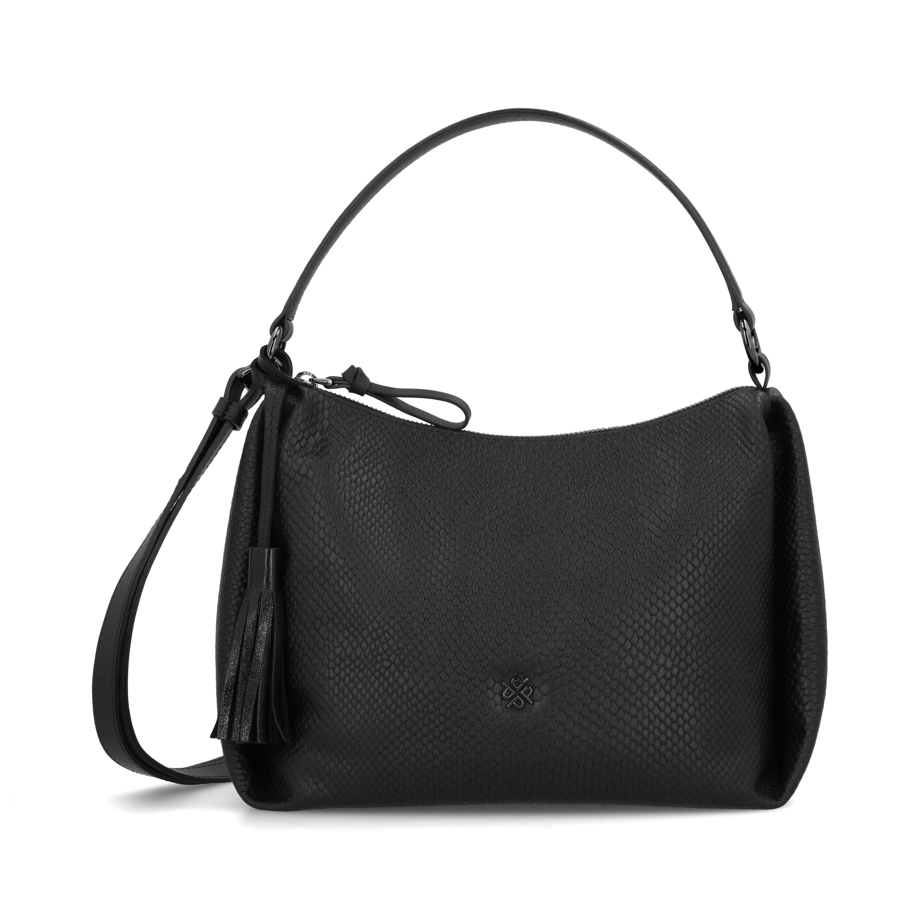 Das geprägte Echtleder macht diese Schultertasche unglaublich langlebig und vielfältig einsetzbar. Ein Reißverschlussfach auf der Rückseite sowie das Hauptfach sind mit einem Reißverschluss gesichert. Die Tasche bietet durch das doppelte Handyfach im Inneren Platz für alle aktuellen Handy-Modelle und sitzt durch den abnehmbaren sowie längenverstellbaren Schultergurt immer perfekt. Die Schlangenprägung setzt einen wunderbaren Glanzpunkt, ohne dabei das Outfit zu dominieren. Vielseitig und elegant!
