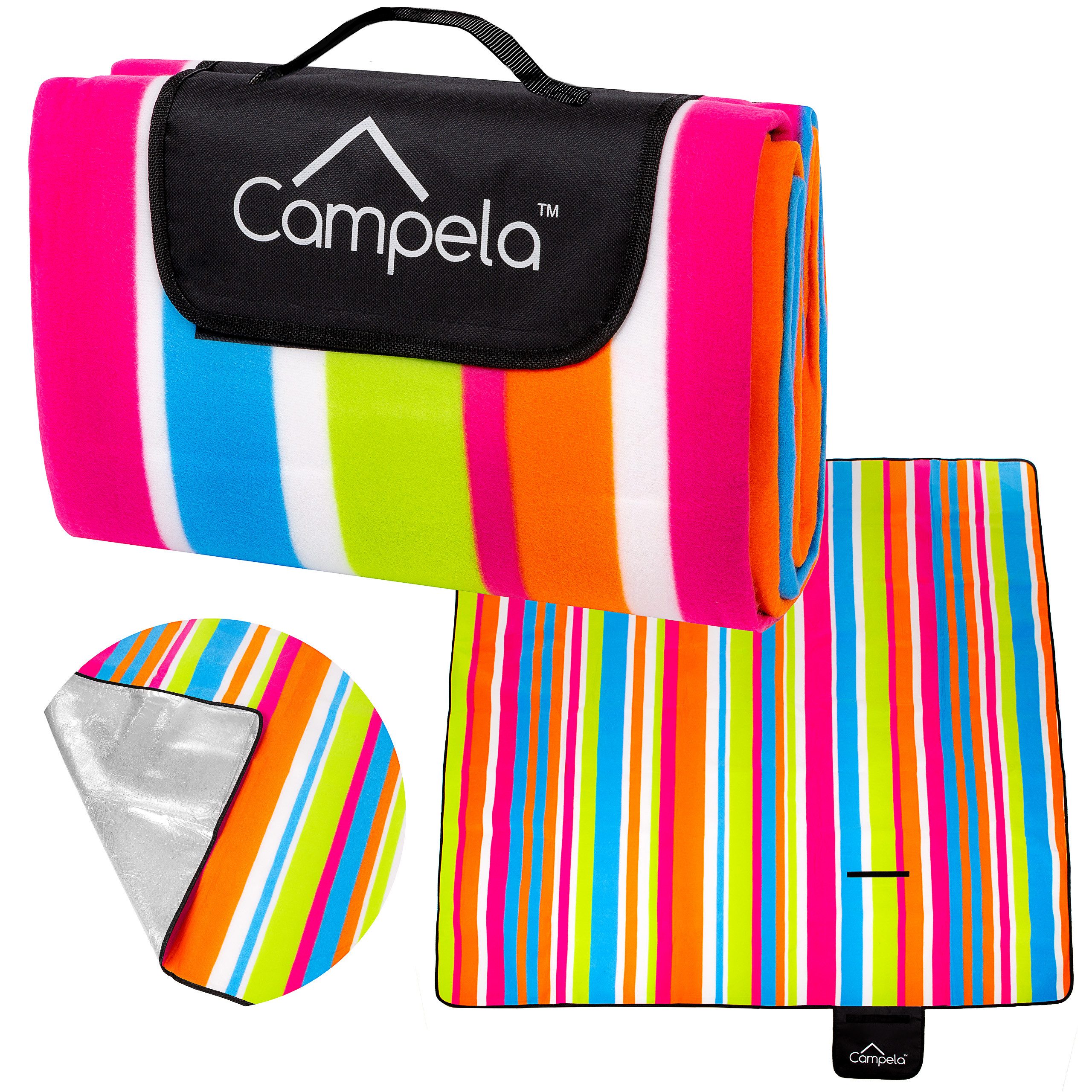 Die Campela Picknickdecke bietet deiner Familie eine hervorragende Isolierung vom Boden – sowohl im Sommer als auch im Herbst – dank der thermischen Folienunterlage. Unsere Picknickmatte überzeugt nicht nur durch ihre hervorragende Wärmedämmung, sondern ist auch wasserdicht. Sie kann problemlos auf feuchtem Untergrund ausgebreitet werden, ohne dass sie Nässe aufnimmt. Zudem ist die Decke leicht faltbar, was sie zu einer praktischen Lösung für den Transport macht. 3-lagige Picknickdecke mit Isolierung Fleece-Schicht Schaumpolsterung Aluminiumbeschichtung